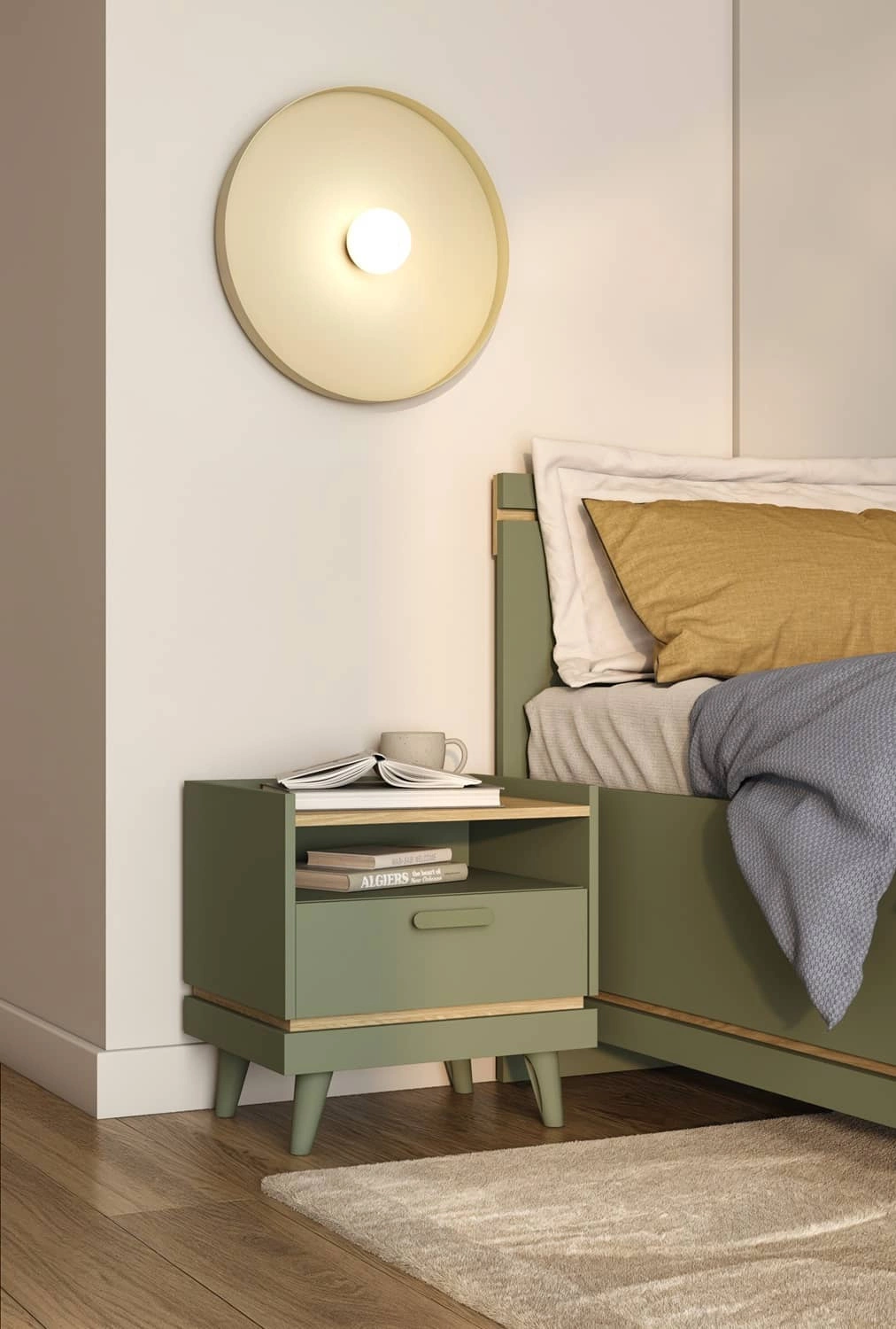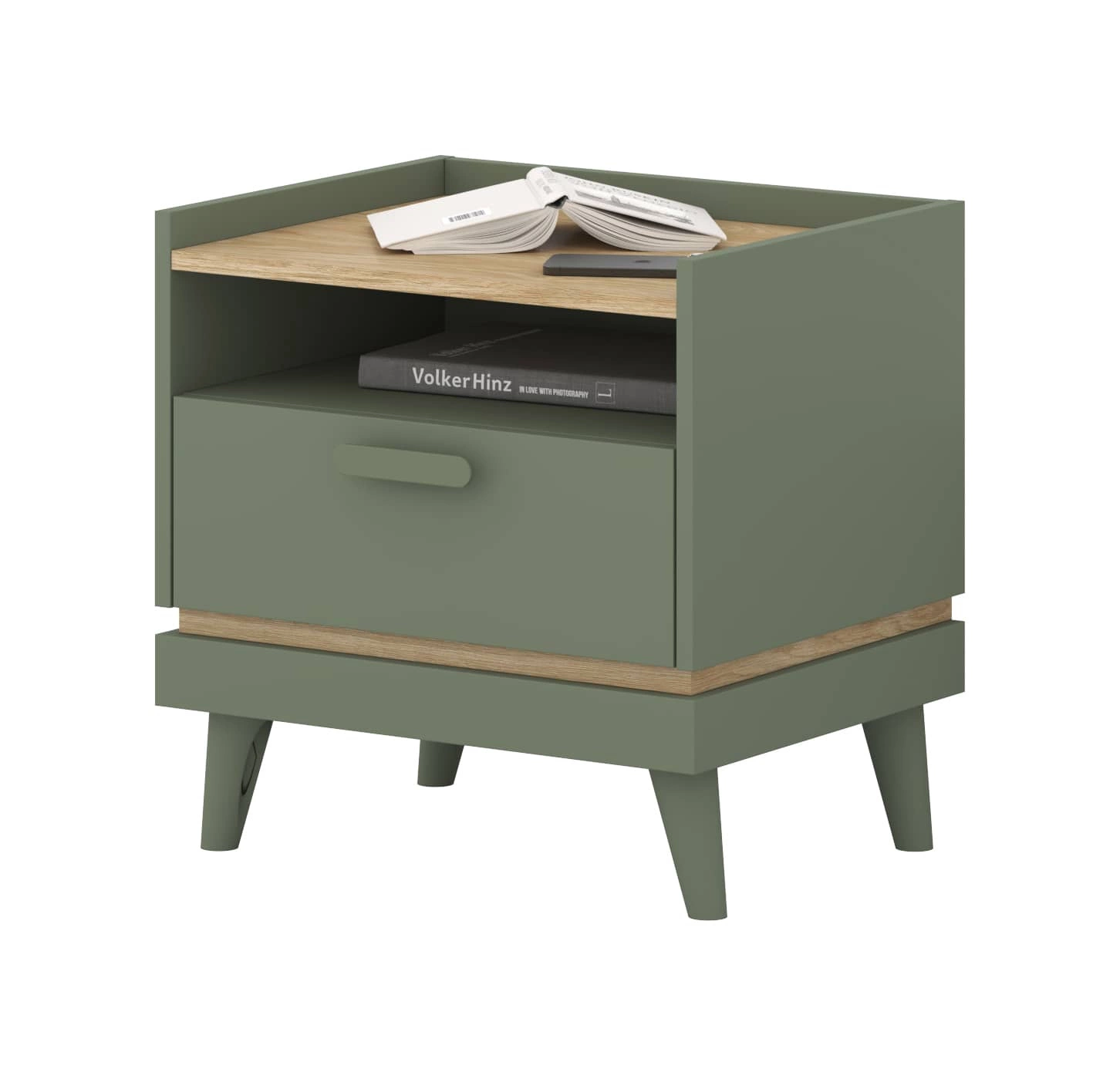 Szafka nocna z szufladą Scandia w kolorze zielony / dąb olejowany to idealne dopełnienie każdej sypialni lub pokoju młodzieżowego.