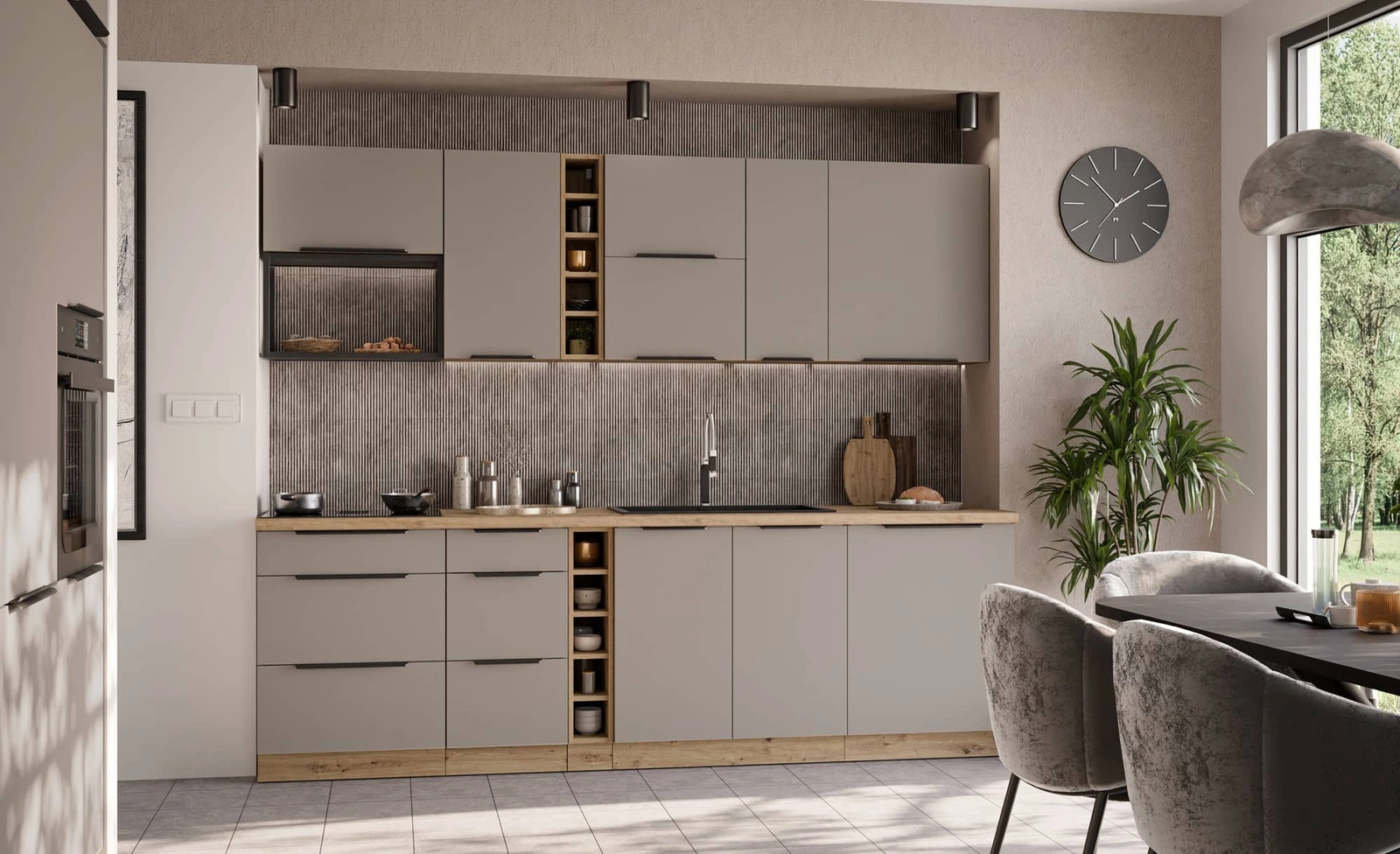 Szafka kuchenna z kolekcji Fiuggi Ar została zaprojektowana z myślą o wszystkich, którzy cenią sobie estetykę oraz poszukują funkcjonalnych rozwiązań do swojej kuchni. Prosta bryłagładka powierzchnia oraz wyjątkowy kolor frontów połączony z eleganckim odcieniem korpusów sprawia, że szafki kuchenne Fiuggi Ar wpasują się we wnętrze w każdym stylu. Meble kuchenne Fiuggi Ar charakteryzują się solidną jakością wykonania, a także użytkowym wzornictwem. Dodatkową zaletą mebli kuchennych Fiuggi Ar są fronty wykonane w innowacyjnej technologii Anti Fingerprint. Użyta w produkcji mebli technologia zapobiega powstawaniu widocznych śladów dotyku oraz innych zabrudzeń pozwalając zachować perfekcyjny wygląd szafki kuchennej na lata. Meble modułowe do kuchni to produkty wykonane w trosce o komfort podczas codziennego użytkowania i długoletni, elegancki wygląd.