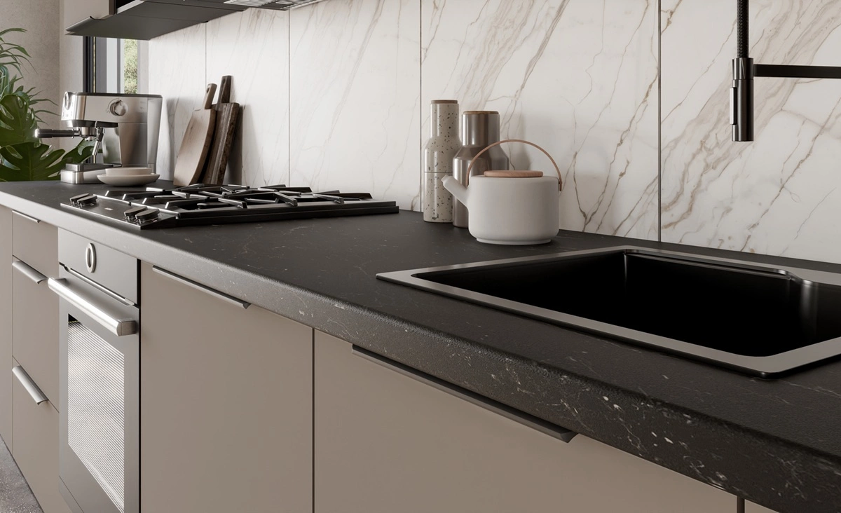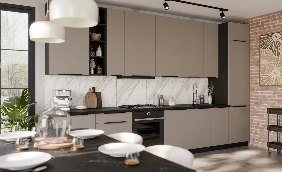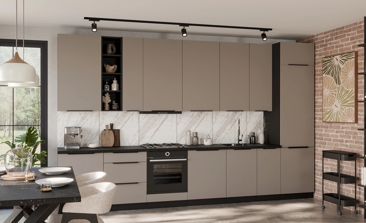 Zestaw mebli kuchennych Fiuggi Bl w kolorze czarny / sandgrau to propozycja gotowego zestawu mebli do kuchni, który doskonale prezentuje się w nowoczesnych wnętrzach.