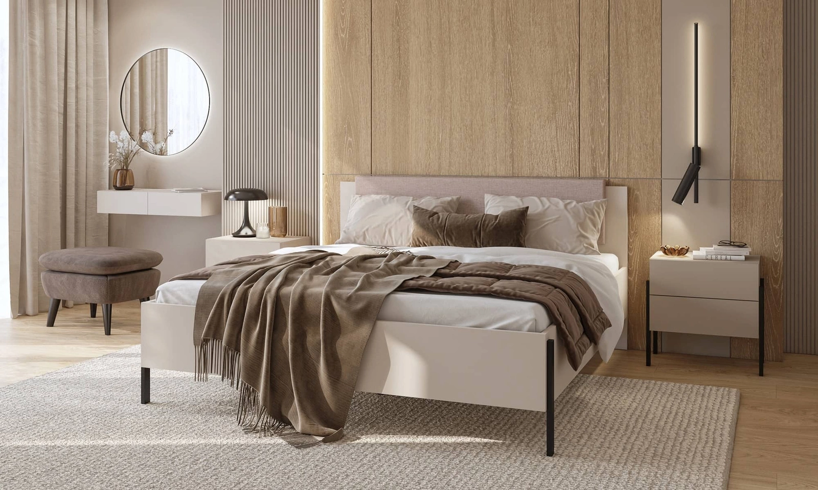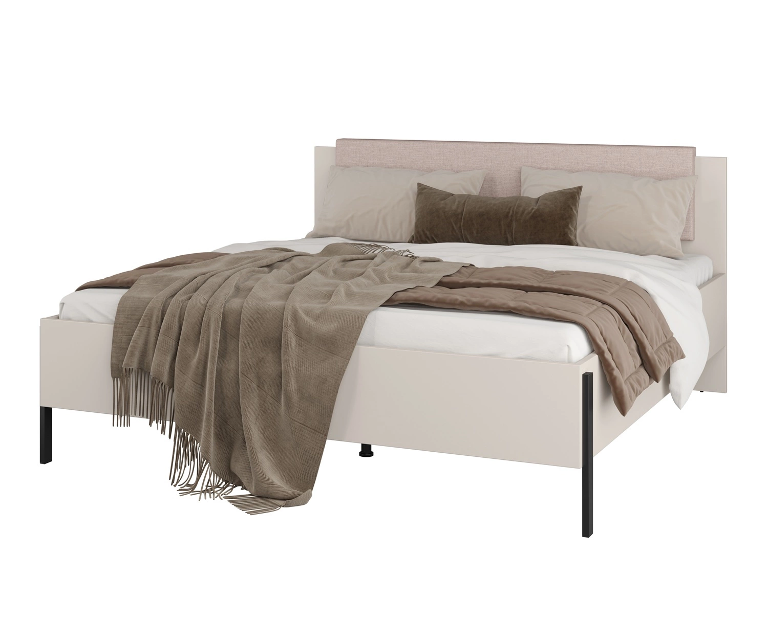Łóżko Jukon S zachwyci wszystkich miłośników wyrafinowanych aranżacji. Mebel wyróżnia się prostotą oraz elegancją, a także zaskakuje szeroką funkcjonalnością. Oryginalna kolorystyka i geometryczny kształt stworzy niepowtarzalny klimat w każdym wnętrzu. Niezwykle modny beżowy kolor oraz smukłe, metalowe nogi w kolorze czarnym podkreślają elegancką stylistykę kolekcji Jukon S. Częściowo tapicerowany zagłówek wykonany z miękkiej i miłej w dotyku tkaniny w kolorze beżowym to element, który przyciąga wzrok. Dzięki tapicerowanemu oparciu łóżko zyskuje kolejną funkcję. Można wygodnie siedzieć na łóżku, np. oglądając telewizję, pracując przy laptopie lub czytając książki.