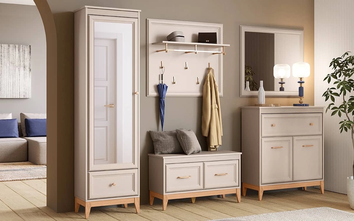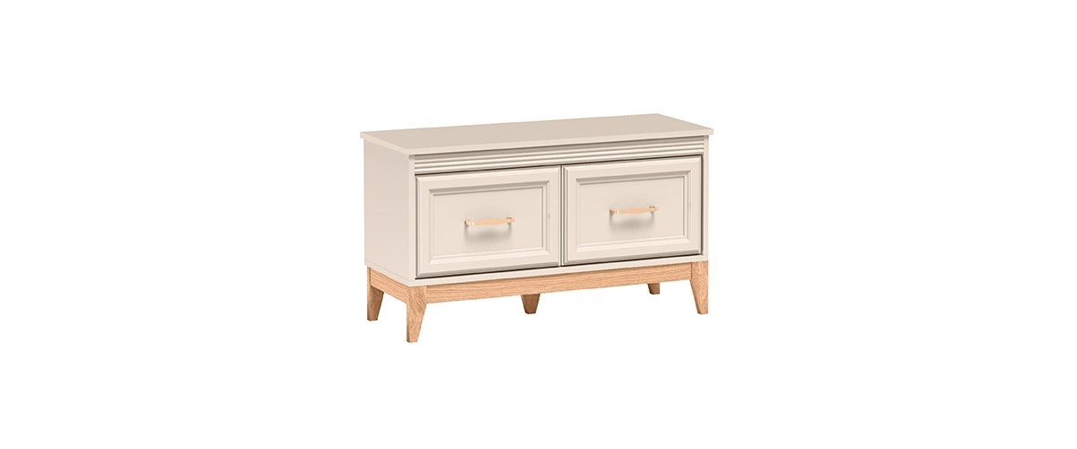 Szafka na buty Windsor to połączenie ponadczasowego stylu z funkcjonalnością, które wprowadzi do każdego wnętrza harmonię i elegancję. Subtelne frezowania na frontach, minimalistyczne uchwyty w kolorze miedzi oraz doskonale dobrane proporcje nadają meblom wyjątkowego charakteru. Naturalne drewniane akcenty ocieplają przestrzeń, tworząc przytulne, a jednocześnie stylowe wnętrze. Delikatny kaszmirowy odcień kolekcji Windsor sprawia, że doskonale komponuje się zarówno w klasycznych aranżacjach, jak i tych w stylu modern classic.