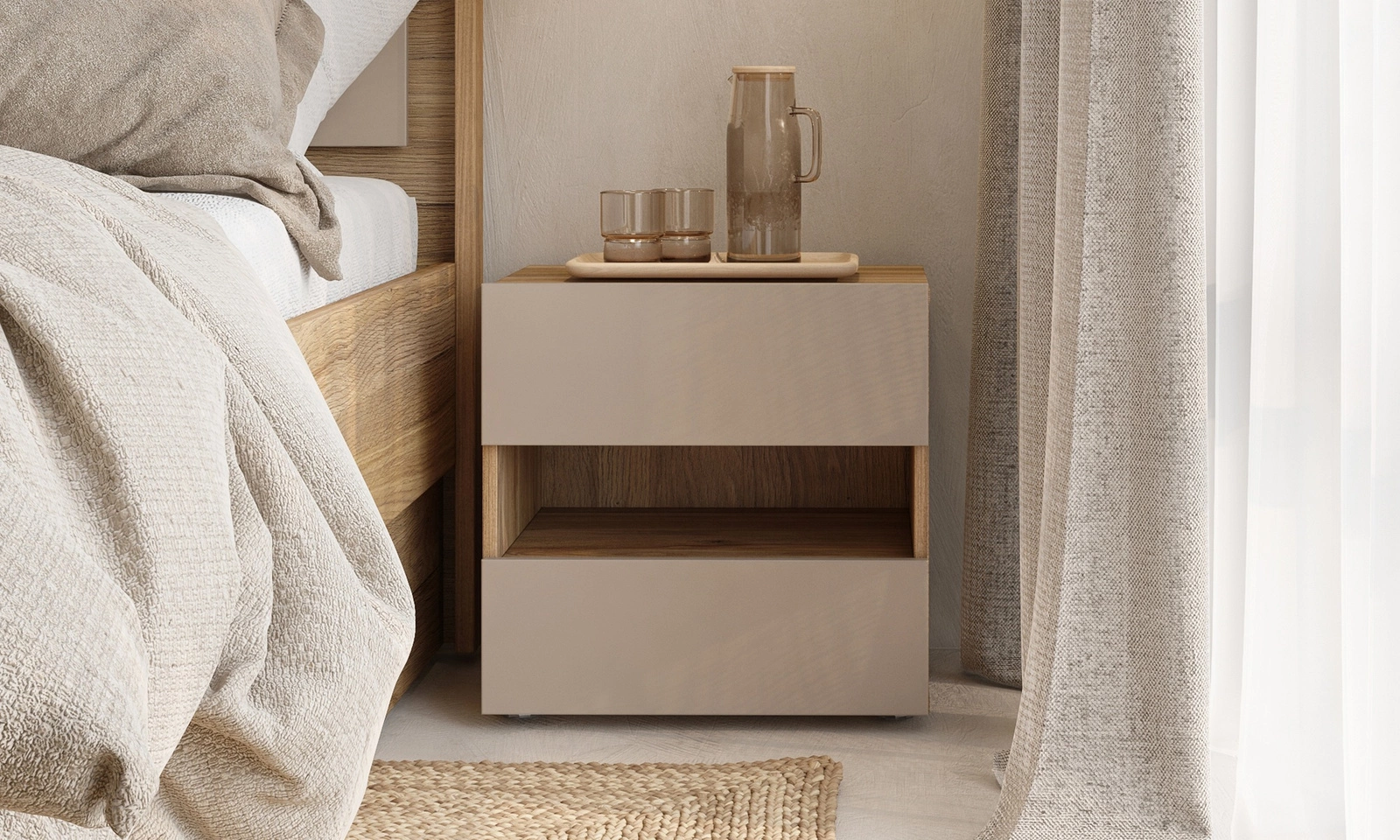 Szafka nocna Impressio zachwyci wszystkich miłośników wyrafinowanych aranżacji. Mebel wyróżnia się prostotą oraz elegancją, a także zaskakuje szeroką funkcjonalnością. Ciepły odcięń dębu mauvella znakomicie współgra z wstawkami w kolorze ciemny beżowy nadając meblom nowoczesnego wyglądu i kontrastu. Takie zestawienie kolorystyczne doskonale oddaje unikatowy charakter szafki nocnej. Gładkie, bezuchwytowe wykończenie frontów sprawia, że kompozycja szafka nocna z szufladami jest spójna, zamknięta w minimalistycznym tonie. Subtelnie wysunięty front pełni także funkcję uchwytu.