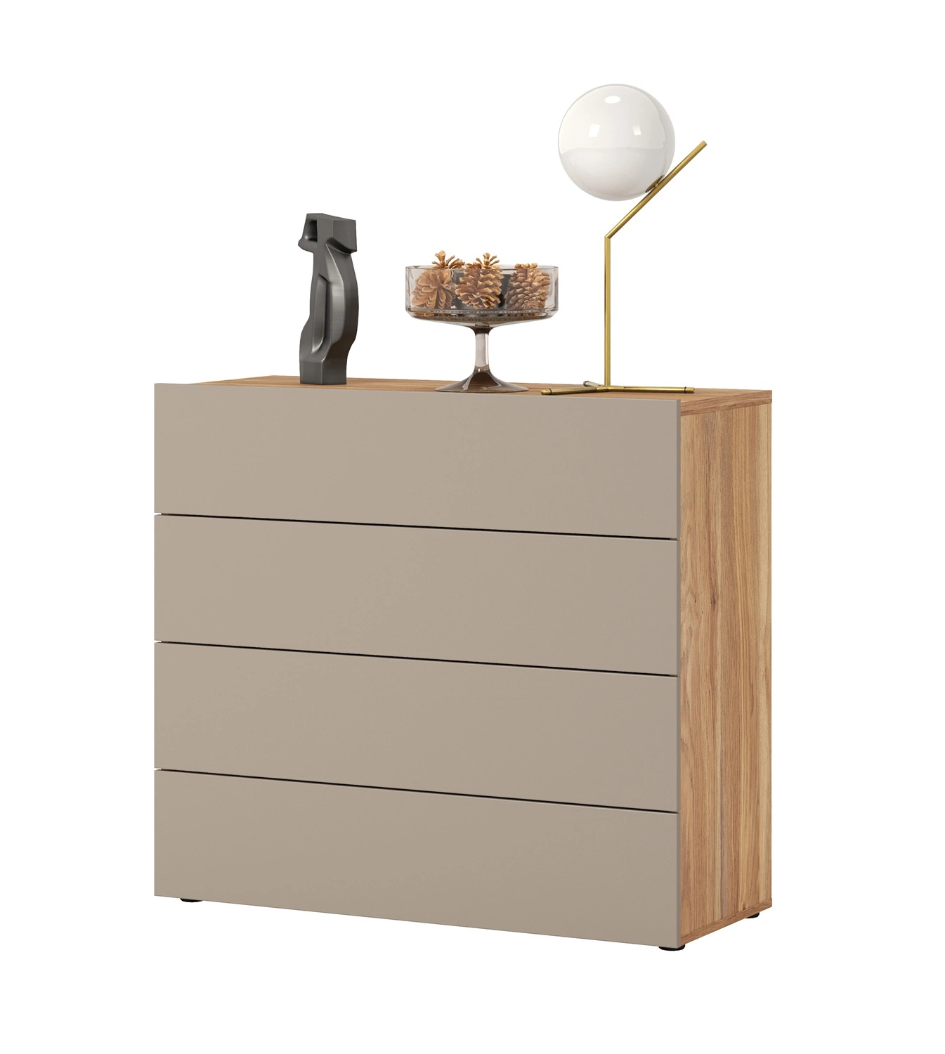 - Komoda z szufladami Impressio to idealna propozycja dla osób ceniących nowoczesne aranżacje. Połączenie ciemnego beżu z dębem mauvella oraz gładkie fronty nadają oryginalności. Lekka stylistyka znajdzie zastosowanie w niemal każdym pomieszczeniu.