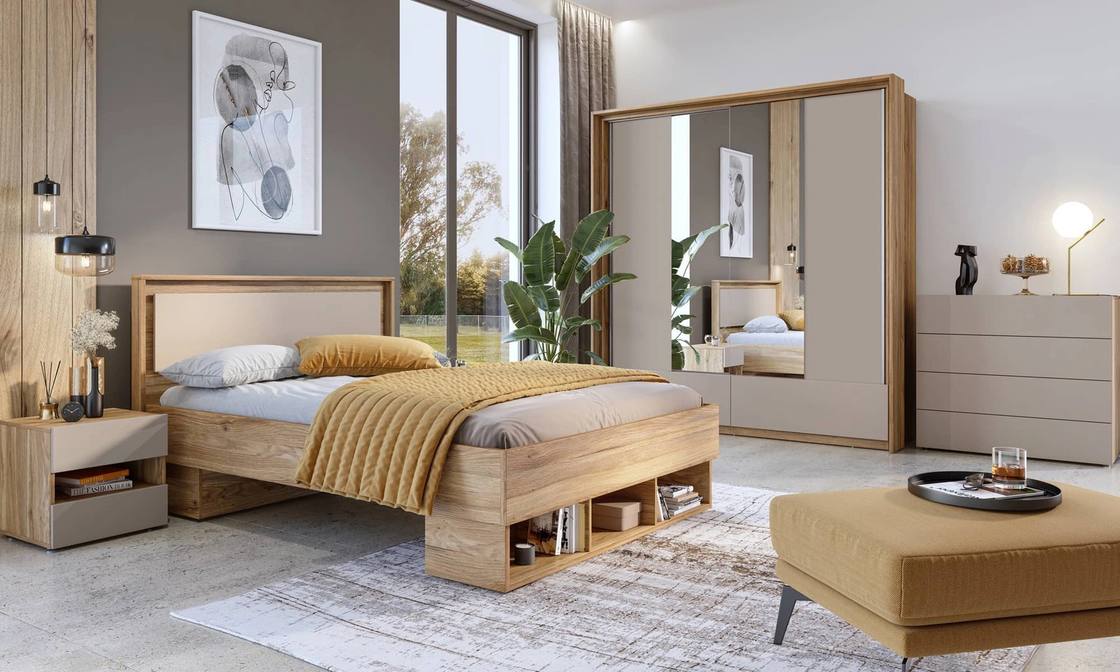 Szafa z kolekcji Impressio zachwyci wszystkich miłośników wyrafinowanych aranżacji. Mebel wyróżnia się prostotą oraz elegancją, a także zaskakuje szeroką funkcjonalnością. Ciepły odcięń dębu mauvella znakomicie współgra z wstawkami w kolorze ciemny beżowy nadając meblom nowoczesnego wyglądu i kontrastu. Takie zestawienie kolorystyczne doskonale oddaje unikatowy charakter szafy. Gładkie, bezuchwytowe wykończenie frontów sprawia, że kompozycja szafy przesuwnej jest spójna, zamknięta w minimalistycznym tonie. Subtelnie wysunięty front pełni także funkcję uchwytu.