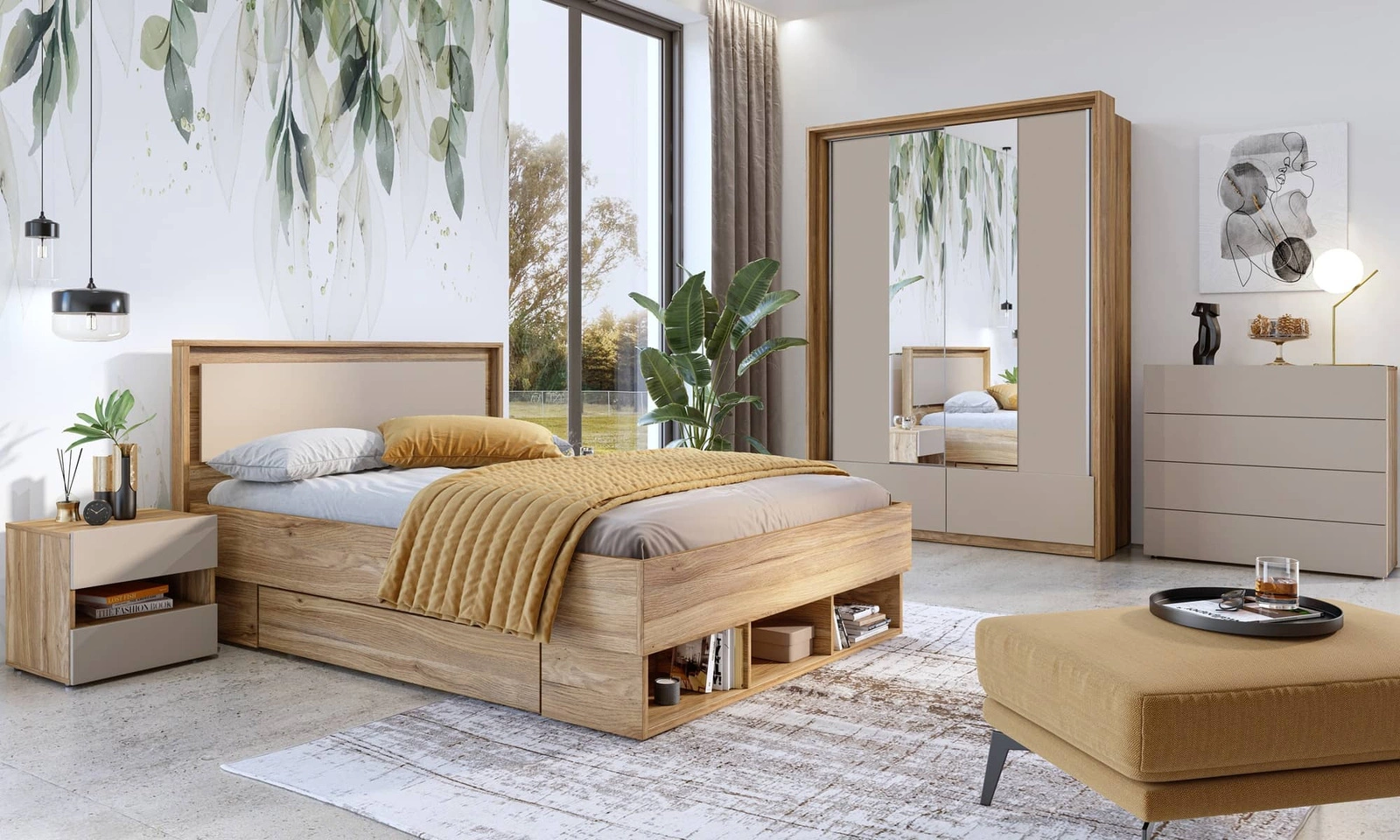 Zestaw mebli do sypialni Impressio dąb mauvella / ciemny beżowy eleganckie i uniwersalne meble do sypialni w nowoczesnym stylu pojemne szuflady