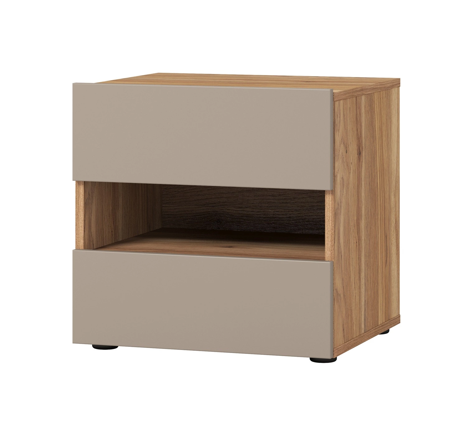 Zestaw mebli do sypialni Impressio zachwyci wszystkich miłośników wyrafinowanych aranżacji. Meble wyróżniają się prostotą oraz elegancją, a także zaskakują szeroką funkcjonalnością. Ciepły odcięń dębu mauvella znakomicie współgra z wstawkami w kolorze ciemny beżowy nadając meblom nowoczesnego wyglądu i kontrastu. Takie zestawienie kolorystyczne doskonale oddaje unikatowy charakter brył. Gładkie, bezuchwytowe wykończenie frontów sprawia, że kompozycja mebli jest spójna, zamknięta w minimalistycznym tonie. Subtelnie wysunięty front pełni także funkcję uchwytu.