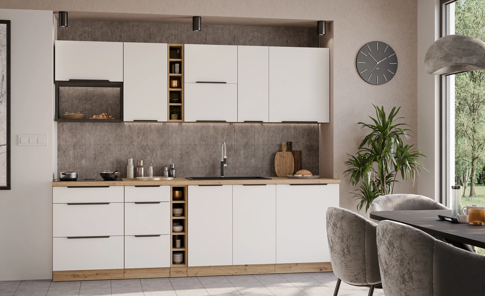 Korpusy i fronty szafek kuchennych zostały wykonane z wysokiej jakości płyty laminowanej o grubości 16 mm. Zaletą tego rodzaju materiałów jest wysoka odporność na wpływ zewnętrznych czynników takich jak para wodna, wysoka temperatura, wilgoć, rozlane ciecze. Użyty materiał jest także odporny na przypadkowe uszkodzenia. Stylowym dopełnieniem frontów szafek kuchennych są czarne, metalowe uchwyty krawędziowe, które poza swoją podstawową funkcją podkreślają również nowoczesny design szafek.