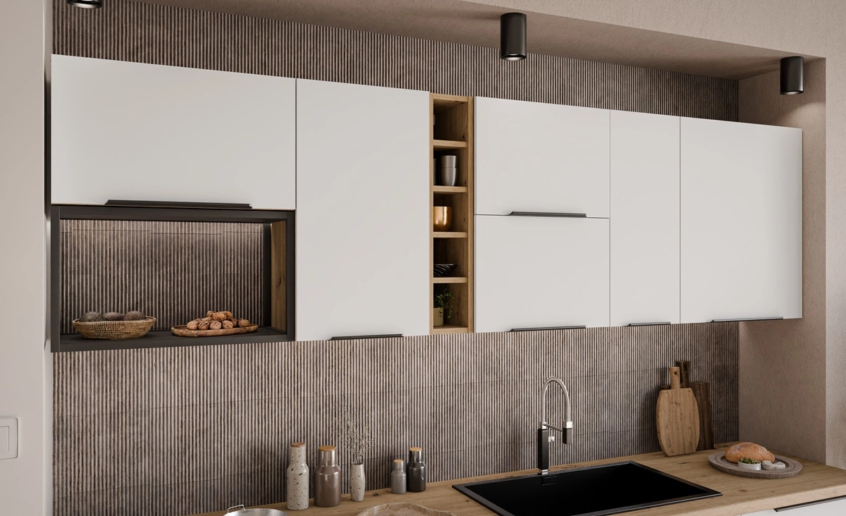 Komfort codziennego użytkowania zapewniają szuflady i zawiasy z systemem cichego domykania, które gwarantują płynne i praktycznie bezgłośne działanie. Szuflady wykonano w technologii Premium Box. Szuflady Premium Box charakteryzują się zwiększoną wytrzymałością, dzięki czemu szafki kuchenne można wypełnić po brzegi przyborami i akcesoriami kuchennymi. Półki nie są przykręcone do korpusów szafek, dzięki czemu można dostosować ich poziom ułożenia lub je wyciągnąć i uzyskać miejsce na wysokie przedmioty. Drzwi są uniwersalne i można je zamontować po prawej lub po lewej stronie. Szafki kuchenne górne wyposażono w system zawieszania na uniwersalnej listwie montażowej.