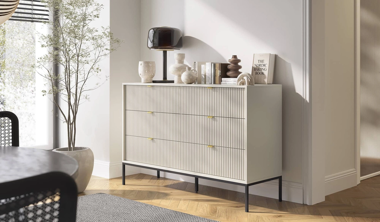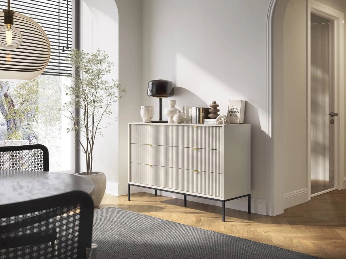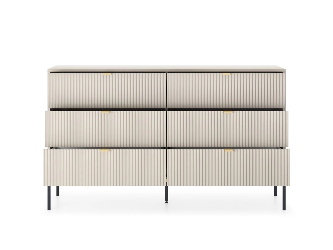 Komoda z szufladami Lovro 154 cm beżowa nowoczesny design zachwyci miłośników wyrazistych wnętrz ryflowane fronty metalowe uchwyty