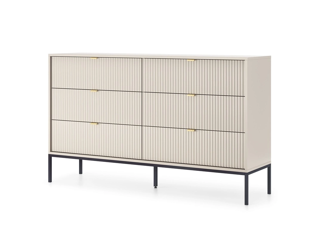 Ryflowane fronty wykonane z płyty MDF o grubości 18mm dodają szczególnego uroku. Stylowym wykończeniem frontów komody są uchwyty krawędziowe w kolorze złotym. Konstrukcję mebla urozmaicono czarnymi metalowymi nogami o wysokości 20 cm.