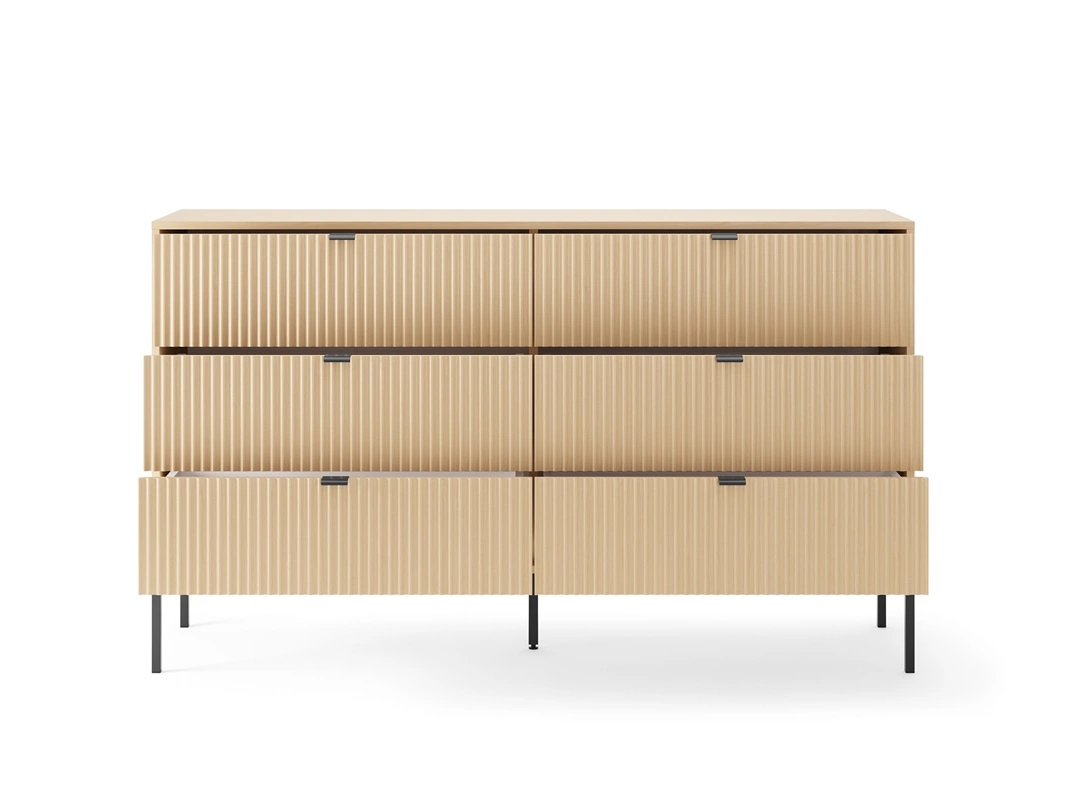 Ryflowane fronty wykonane z płyty MDF o grubości 18mm dodają szczególnego uroku. Stylowym wykończeniem frontów komody są czarne uchwyty krawędziowe. Konstrukcję mebla urozmaicono czarnymi metalowymi nogami o wysokości 20 cm.