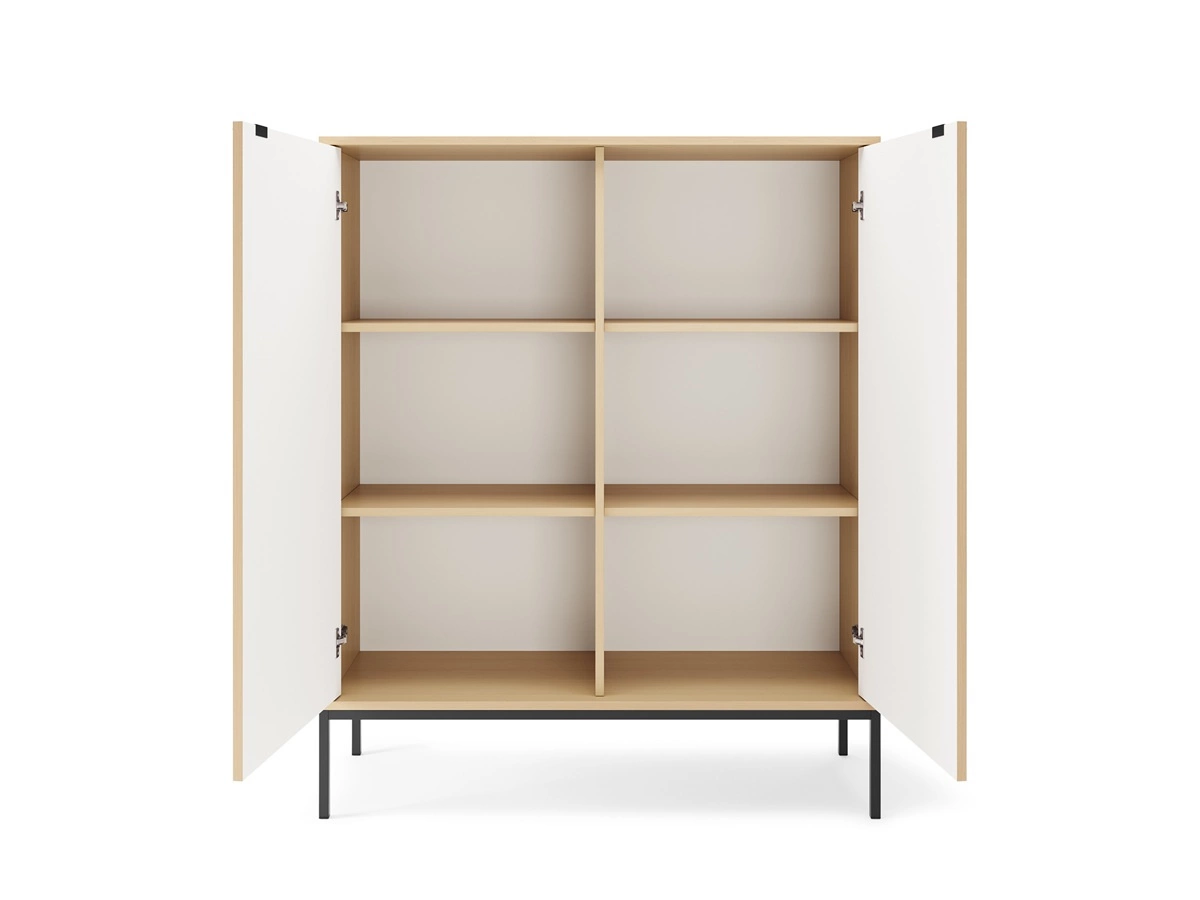 Komoda jest skonstruowana z 2 drzwi. Komoda gwarantuje komfortowe i bezproblemowe korzystanie oraz trwałość całego mebla przez wiele lat użytkowania. Ciepły odcień dębu vicenza świetnie odnajdą się w odważnych aranżacjach, dzięki czemu komoda Lovro świetnie sprawdzi się w roli komody do salonu o luksusowym wykończeniu, komody do pokoju dziennego lub komody do sypialni w nowoczesnym stylu. Komoda wysoka z powodzeniem odnajdzie się także jako mebel biurowy.