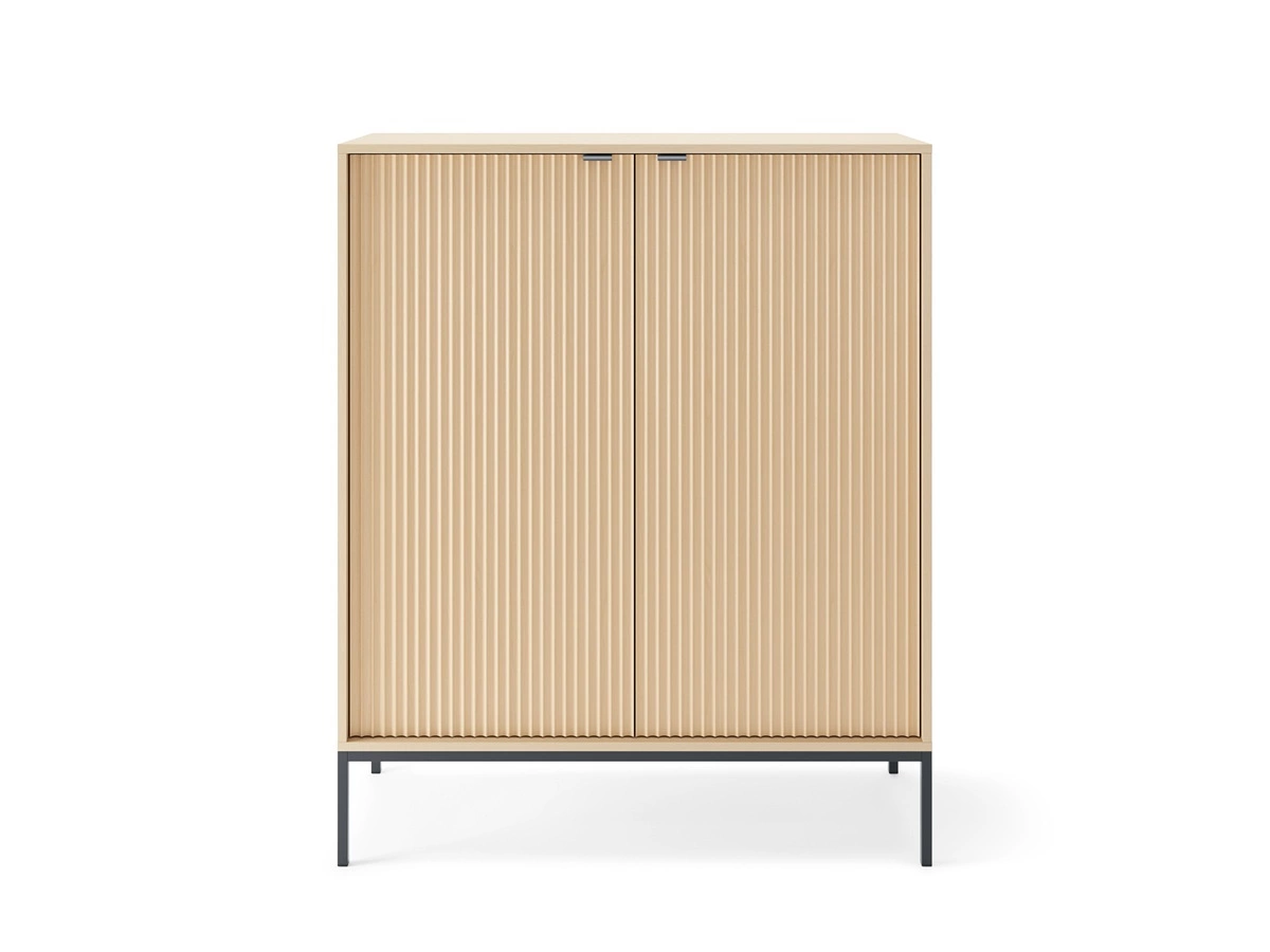 Ryflowane fronty wykonane z płyty MDF o grubości 18mm dodają szczególnego uroku. Stylowym wykończeniem frontów komody są czarne uchwyty krawędziowe. Konstrukcję mebla urozmaicono czarnymi metalowymi nogami o wysokości 20 cm.