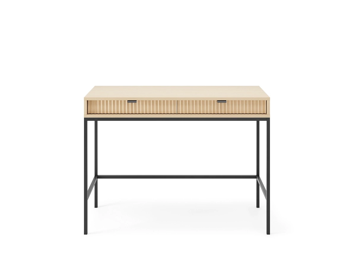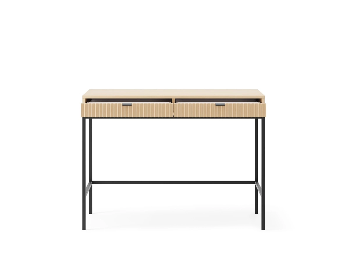 Ryflowane fronty wykonane z płyty MDF o grubości 18mm dodają szczególnego uroku. Stylowym wykończeniem frontów szuflad są czarne uchwyty krawędziowe. Konstrukcję mebla urozmaicono czarnymi metalowymi nogami o matowym wykończeniu.
