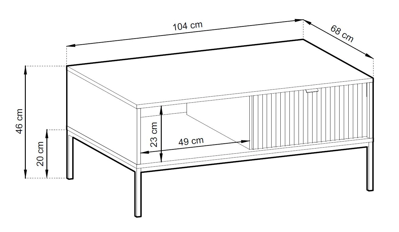 Ryflowane fronty wykonane z płyty MDF o grubości 18mm dodają szczególnego uroku. Stylowym wykończeniem frontów meblościanki są czarne uchwyty krawędziowe. Konstrukcję mebli urozmaicono czarnymi metalowymi nogami o wysokości 20 cm.