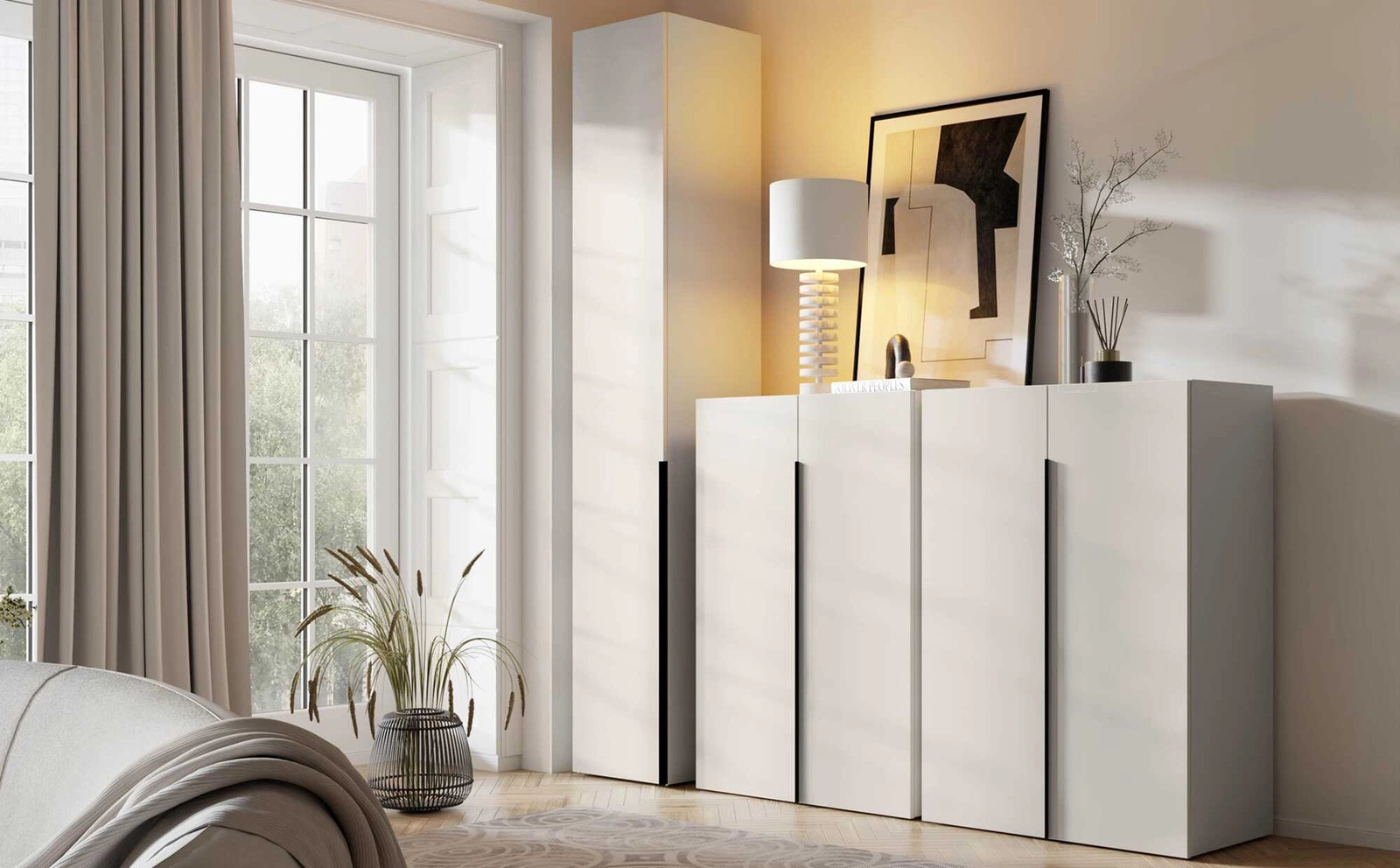 Szafa Slim to stylowy mebel, który dzięki prostym liniom oraz minimalistycznemu wzornictwu stanie się nowoczesną wizytówką każdego wnętrza. Gładkie wykończenie frontu harmonijnie łączy się z subtelną kolorystyką w kaszmirowym odcieniu nadając szafie wyjątkowego wyglądu i niepowtarzalnego charakteru. Elementem przyciągającym wzrok jest pionowy czarny uchwyt, który podkreśla nowoczesny charakter bryły. Bryły z kolekcji Slim to funkcjonalne i stylowe meble, idealne do niewielkich przestrzeni. Ich wąska konstrukcja sprawia, że doskonale sprawdzą się w przedpokoju, sypialni lub salonie, nie zajmując dużo miejsca.