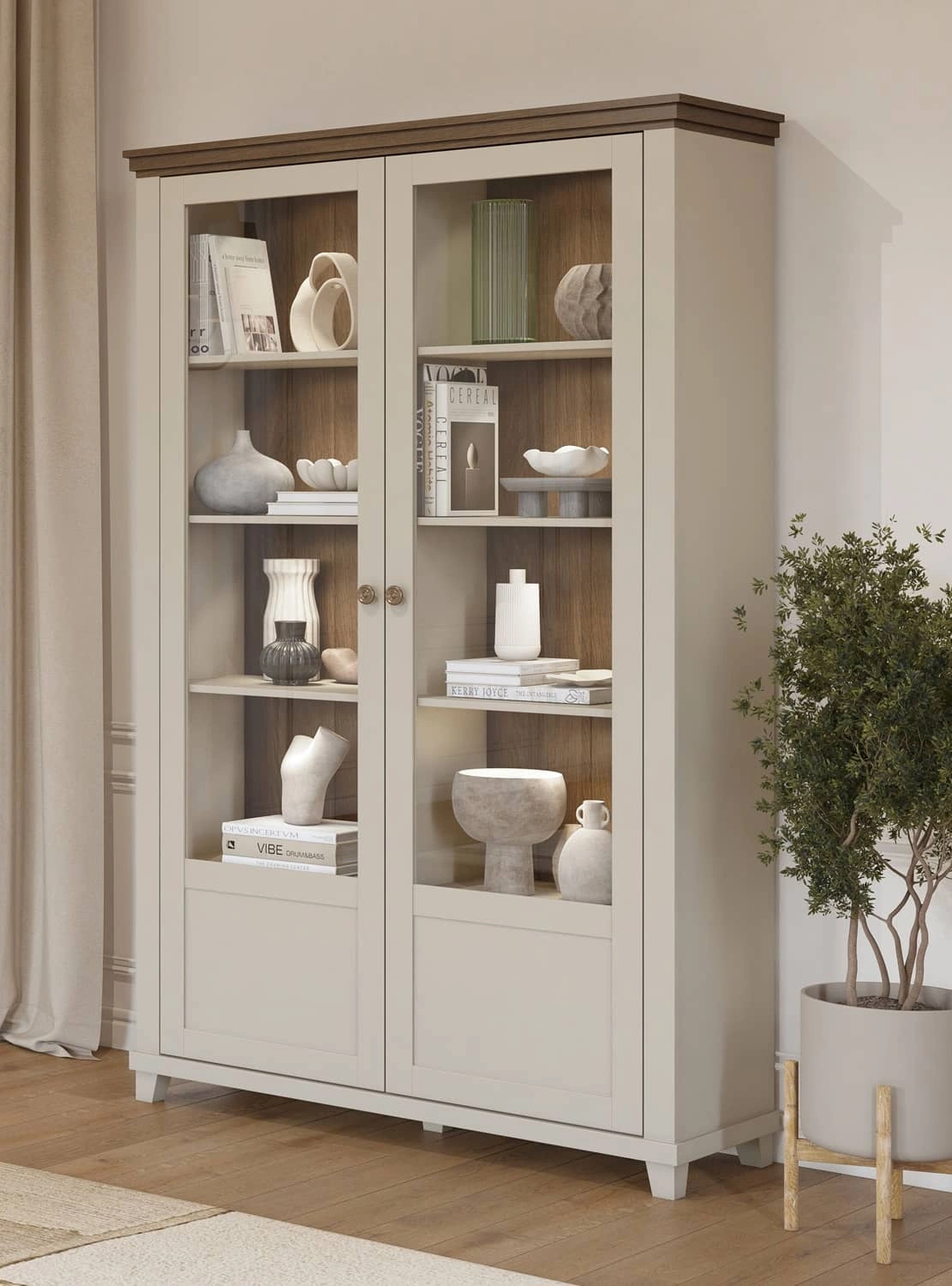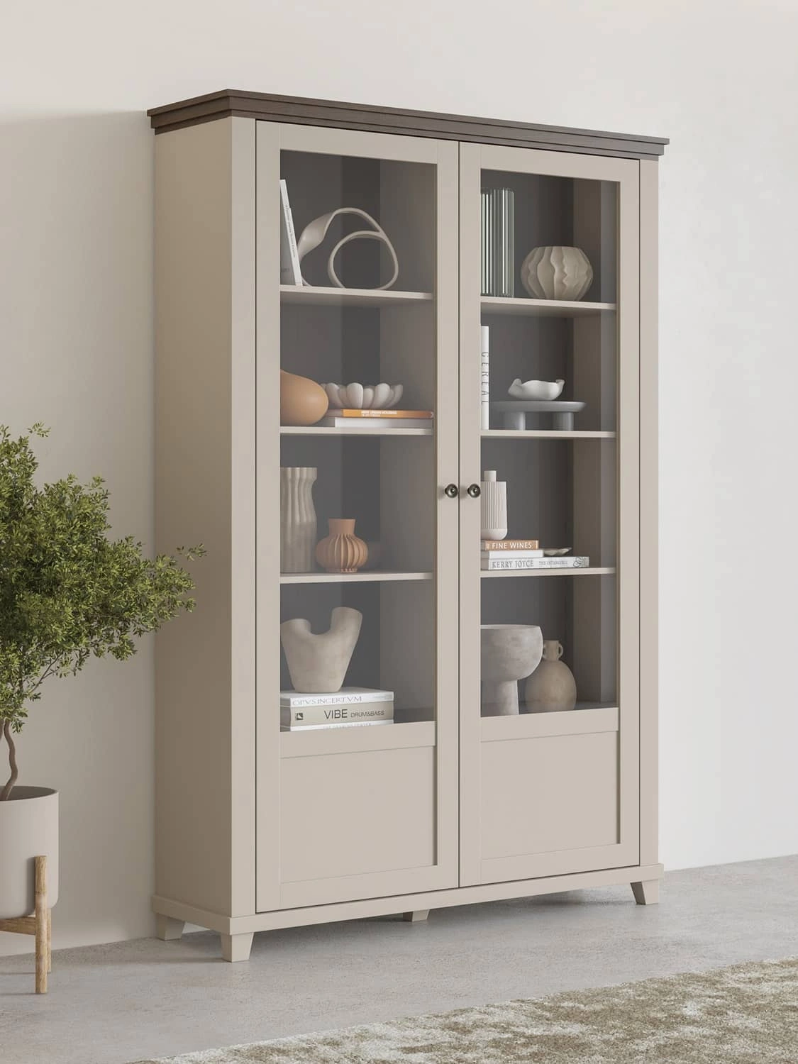 Witryna jest skonstruowana z 2 drzwi. Standardowym wyposażeniem są zawiasy z systemem cichego domykania. Zastosowany system zwiększa komfort i bezpieczeństwo użytkowania mebla. Witryna na książki gwarantuje komfortowe i bezproblemowe korzystanie oraz trwałość całego mebla przez wiele lat użytkowania. Modny beżowy kolor świetnie odnajdzie się w wyrafinowanych aranżacjach, dzięki czemu witryny szklane z kolekcji Evora doskonale sprawdzą się w roli witryny do salonu, witryny do jadalni lub witryny na książki.