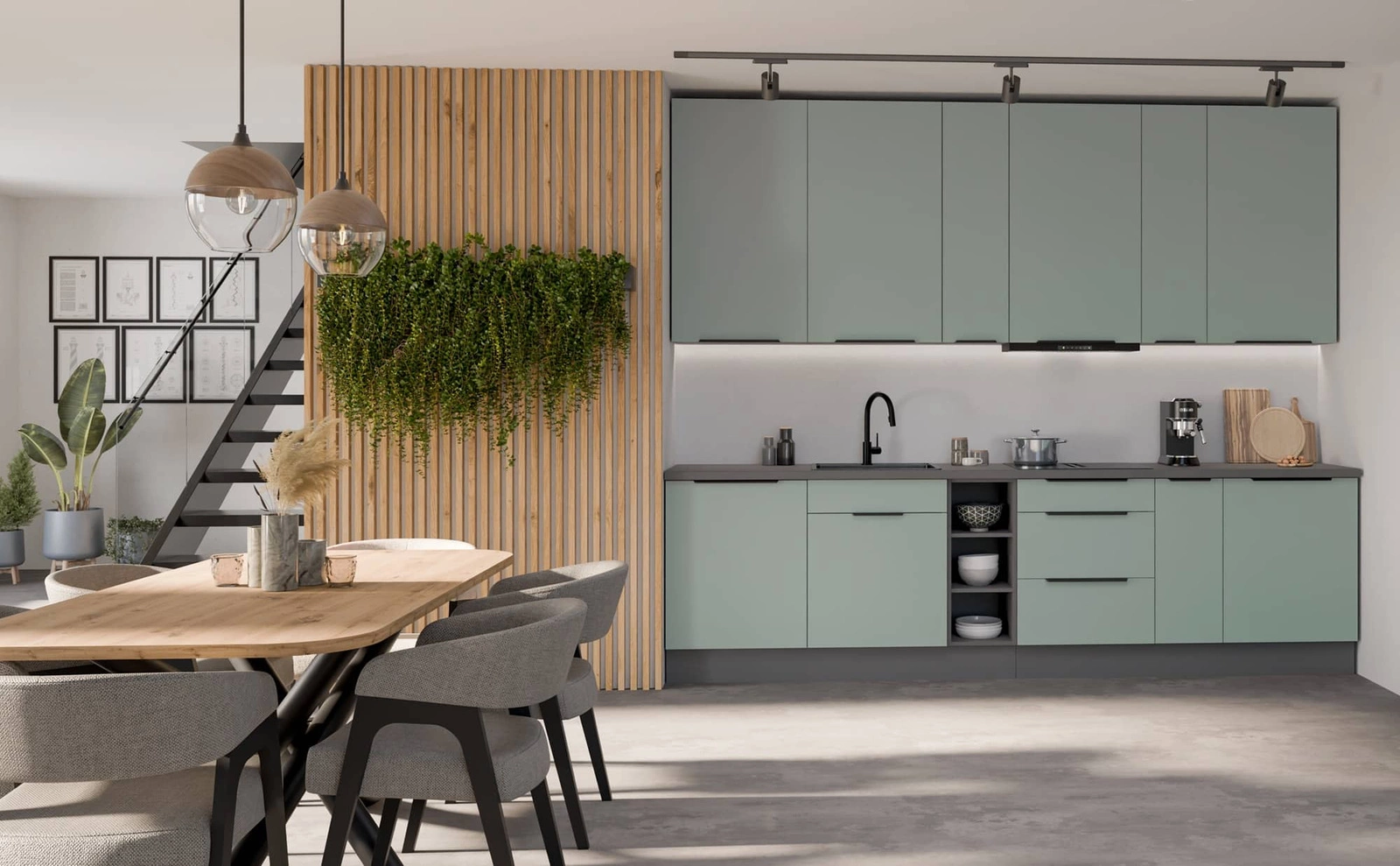 Zestaw mebli kuchennych Treviso Ant w kolorze antracyt / aquamarine to propozycja gotowego zestawu mebli do kuchni, który doskonale prezentuje się w nowoczesnych wnętrzach.