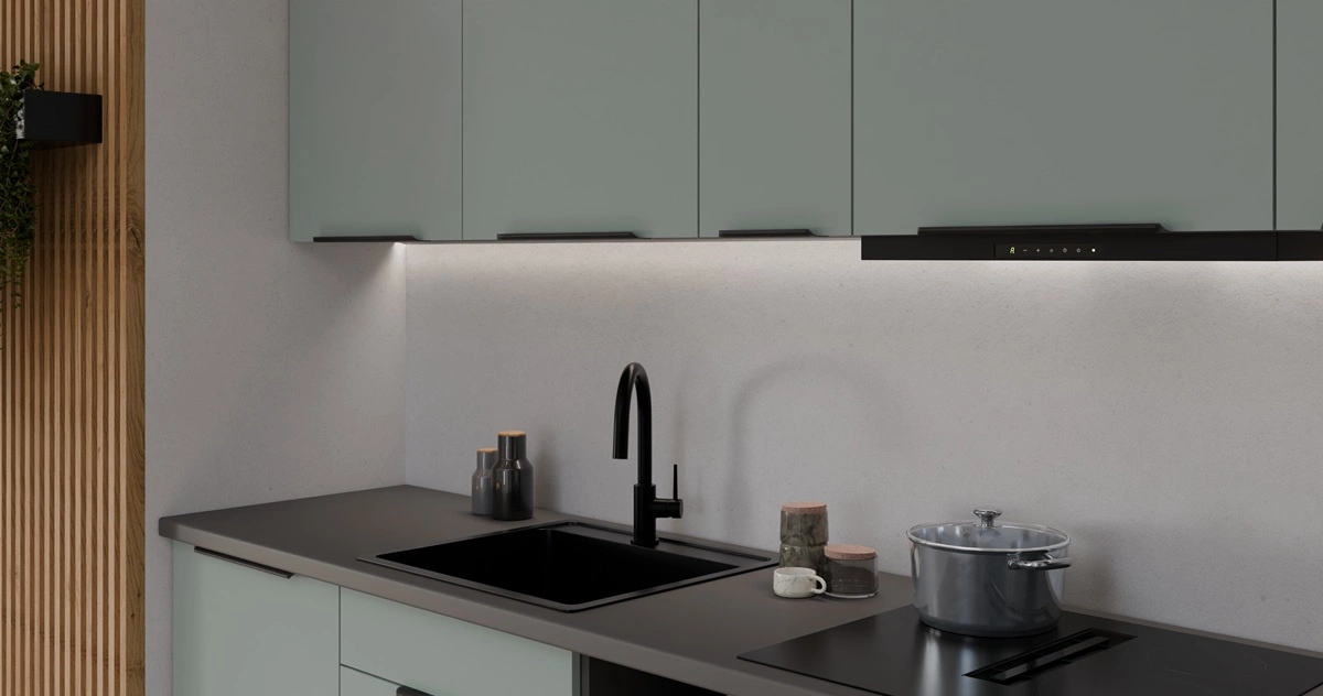 Korpusy i fronty szafek kuchennych zostały wykonane z wysokiej jakości płyty laminowanej o grubości 16 mm. Zaletą tego rodzaju materiałów jest wysoka odporność na wpływ zewnętrznych czynników takich jak para wodna, wysoka temperatura, wilgoć, rozlane ciecze. Użyty materiał jest także odporny na przypadkowe uszkodzenia. Stylowym dopełnieniem frontów szafek kuchennych są czarne, metalowe uchwyty krawędziowe, które poza swoją podstawową funkcją podkreślają również nowoczesny design szafek.