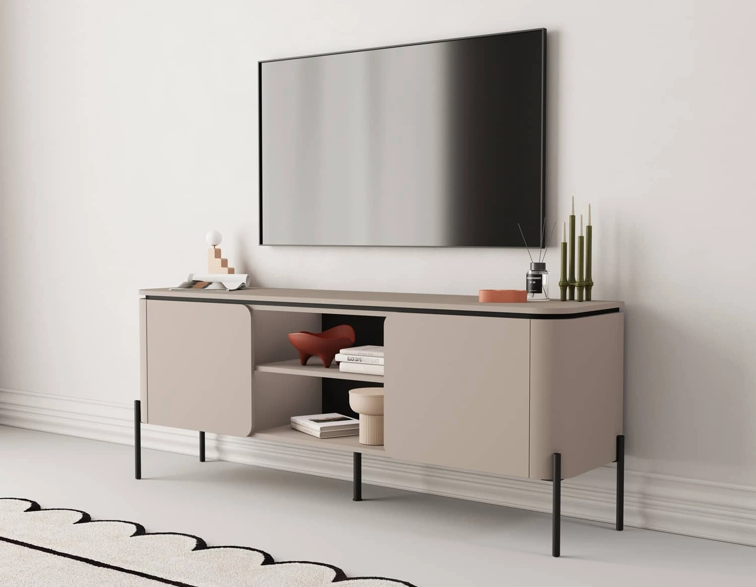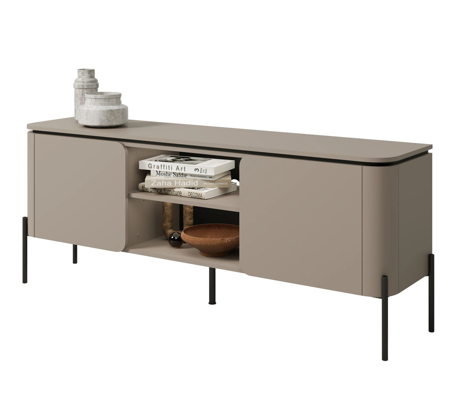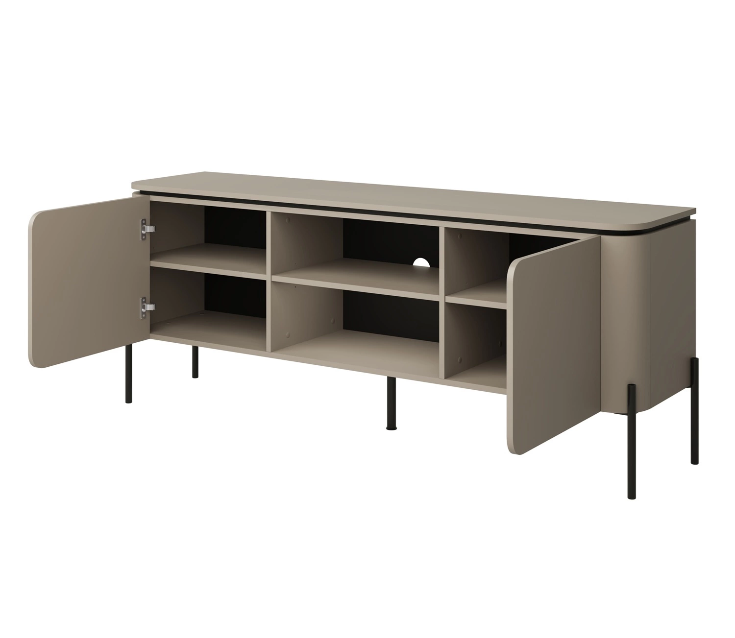 Szafka RTV Belle 163 cm ciemny beżowy elegancka szafka pod telewizor o zaokrąglonym kształcie wsparta na metalowych czarnych nogach