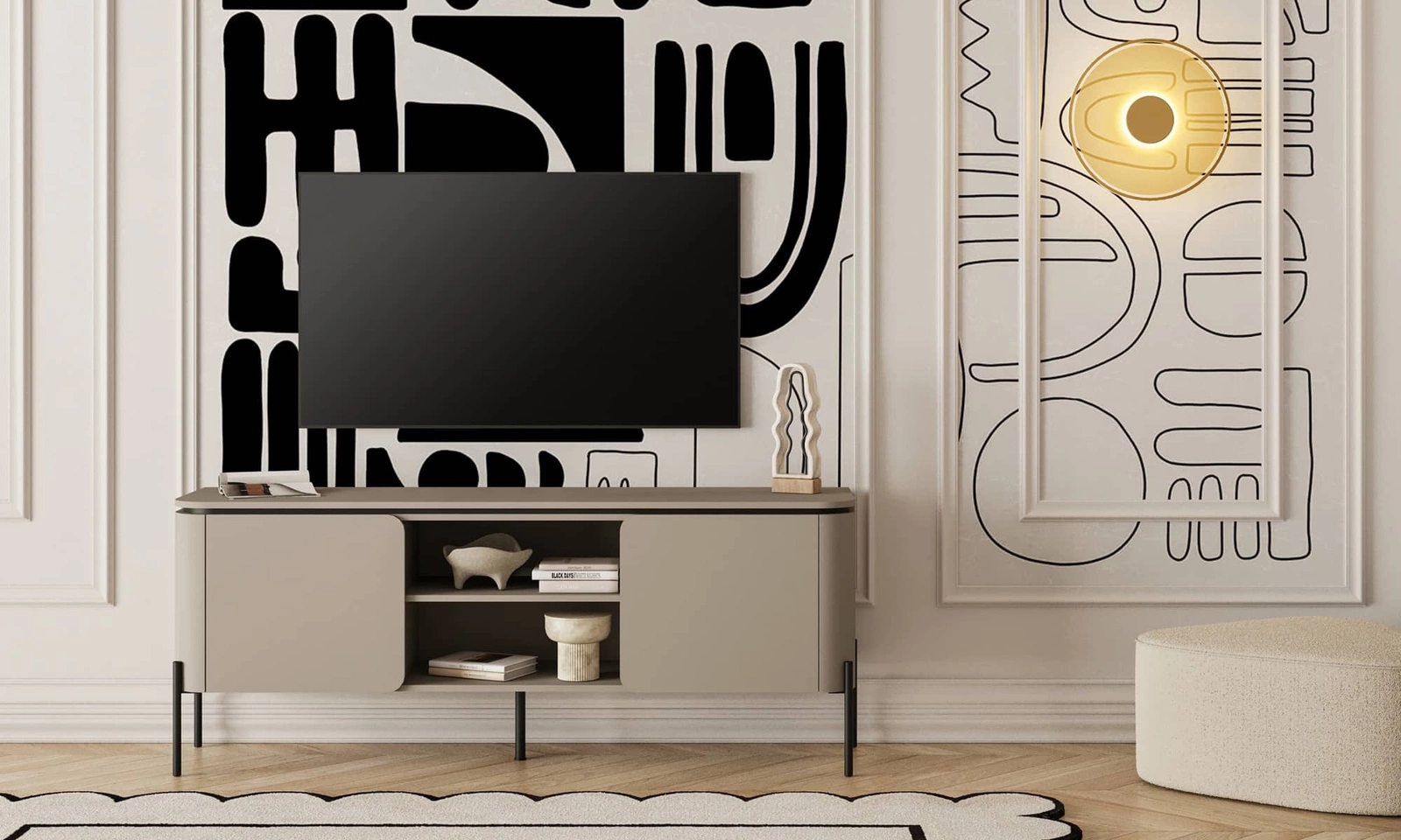 Szafka RTV 163 cm Belle w kolorze ciemny beżowy to doskonała propozycja mebla dla miłośników minimalistycznych wnętrz.