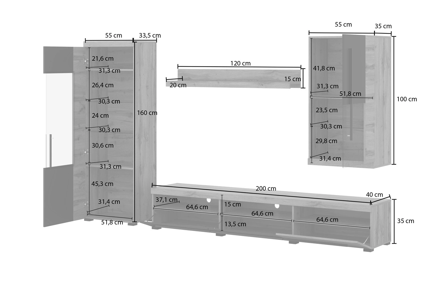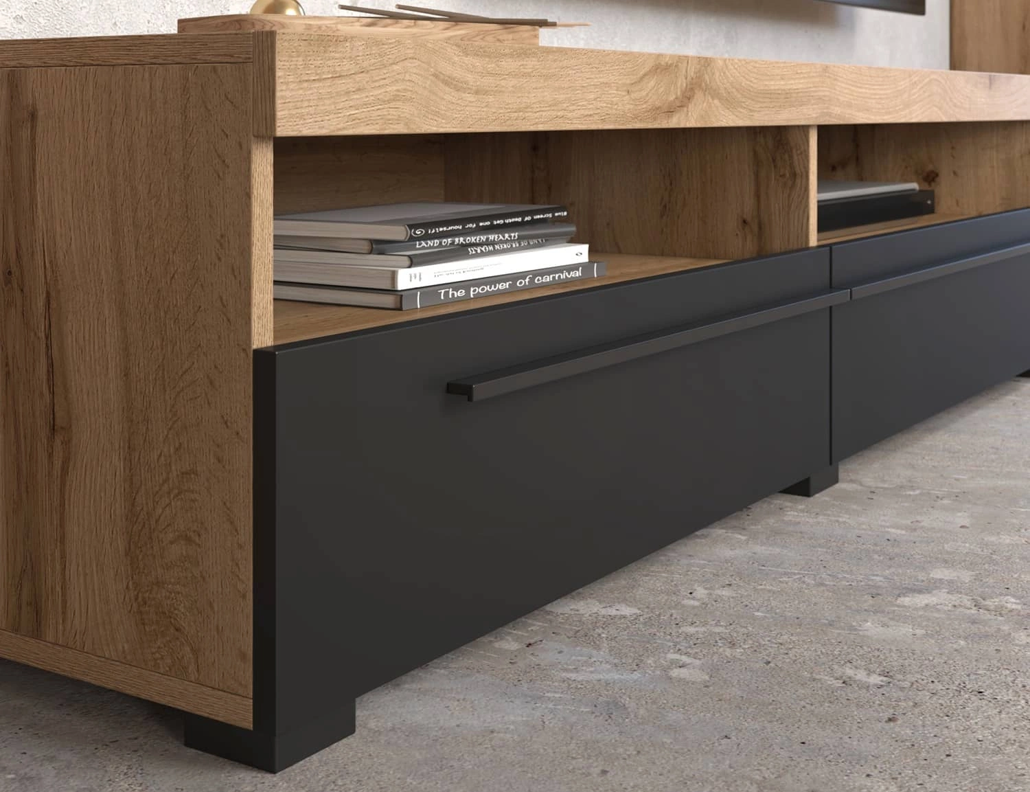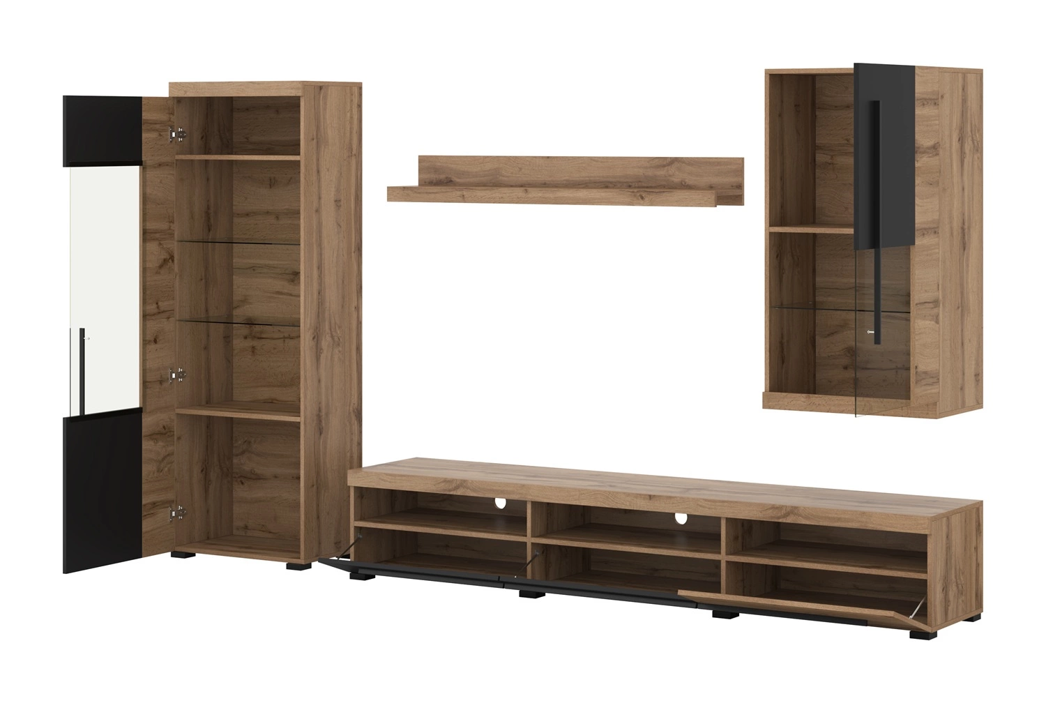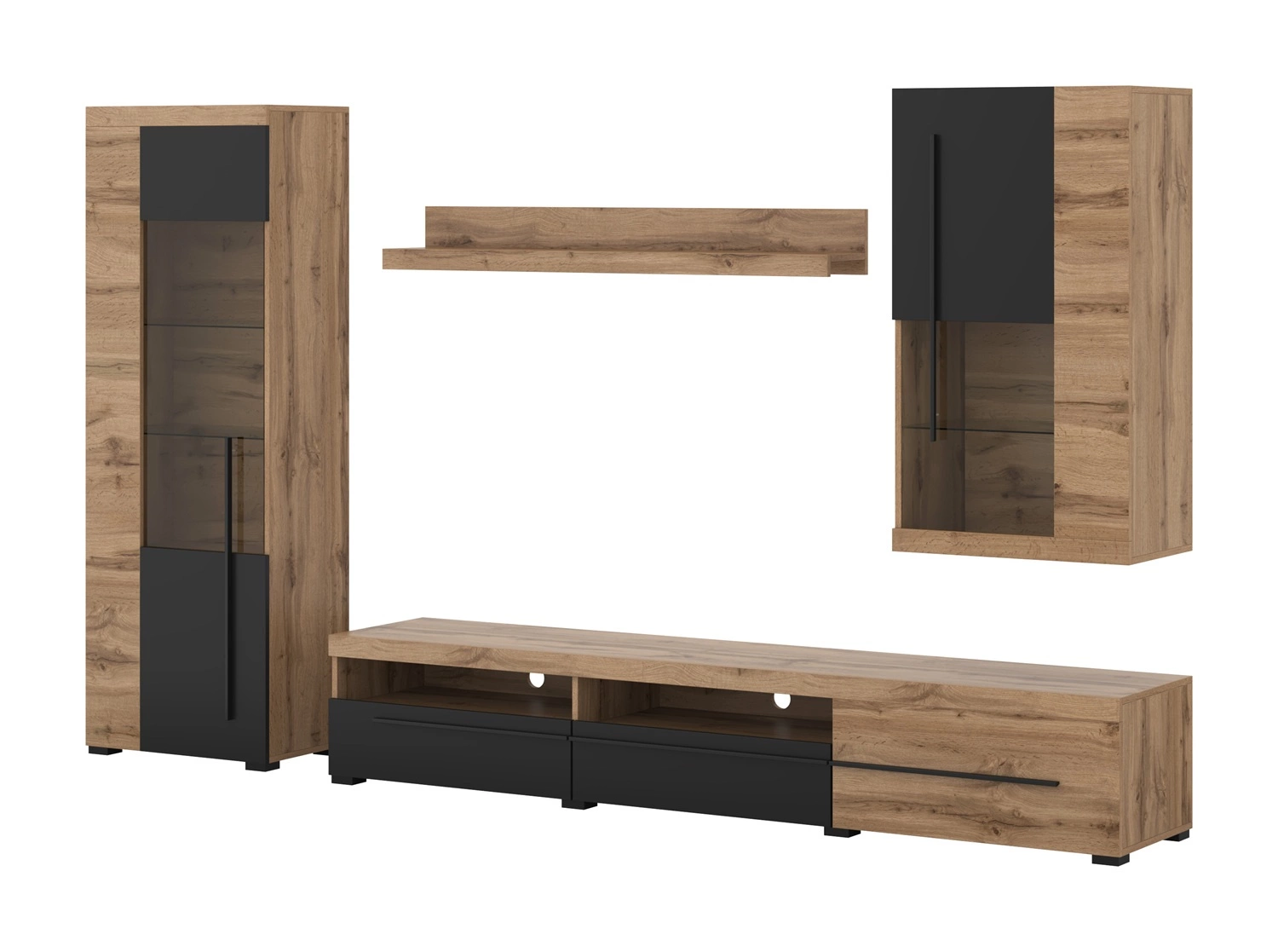 Meblościanka Roger dąb wotan / czarny elegancka stylistyka mebli wzbogacona o stylowe czarne dodatki idealna meblościanka do salonu