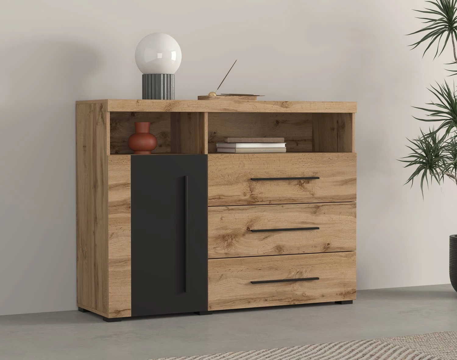 Komoda jest skonstruowana 1 drzwi oraz 3 szuflad oraz półek otwartych. Dębowy dekor bryły świetnie łączy się z innymi kolorami, dzięki czemu komoda z szufladami Roger świetnie sprawdzi się w roli komody do salonu o nowoczesnym wykończeniu, komody do pokoju dziennego lub komody do sypialni w stylu industrialnym. Komoda nowoczesna z powodzeniem odnajdzie się także jako mebel biurowy.