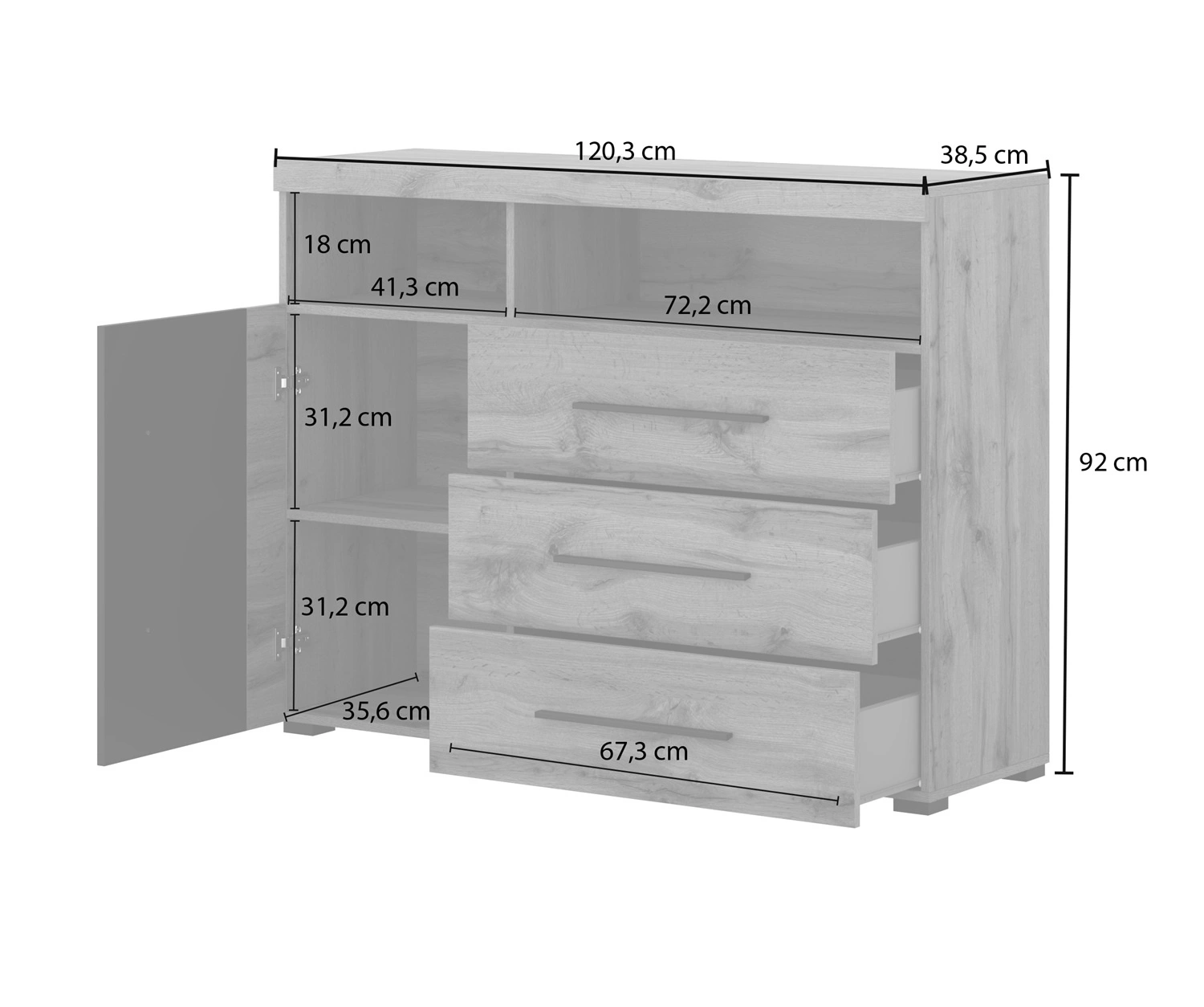 Komoda z szufladami Roger 121 cm to idealny mebel, który wkomponuje się do każdego salonu lub pokoju dziennego.
