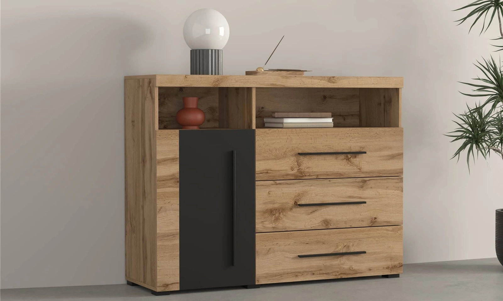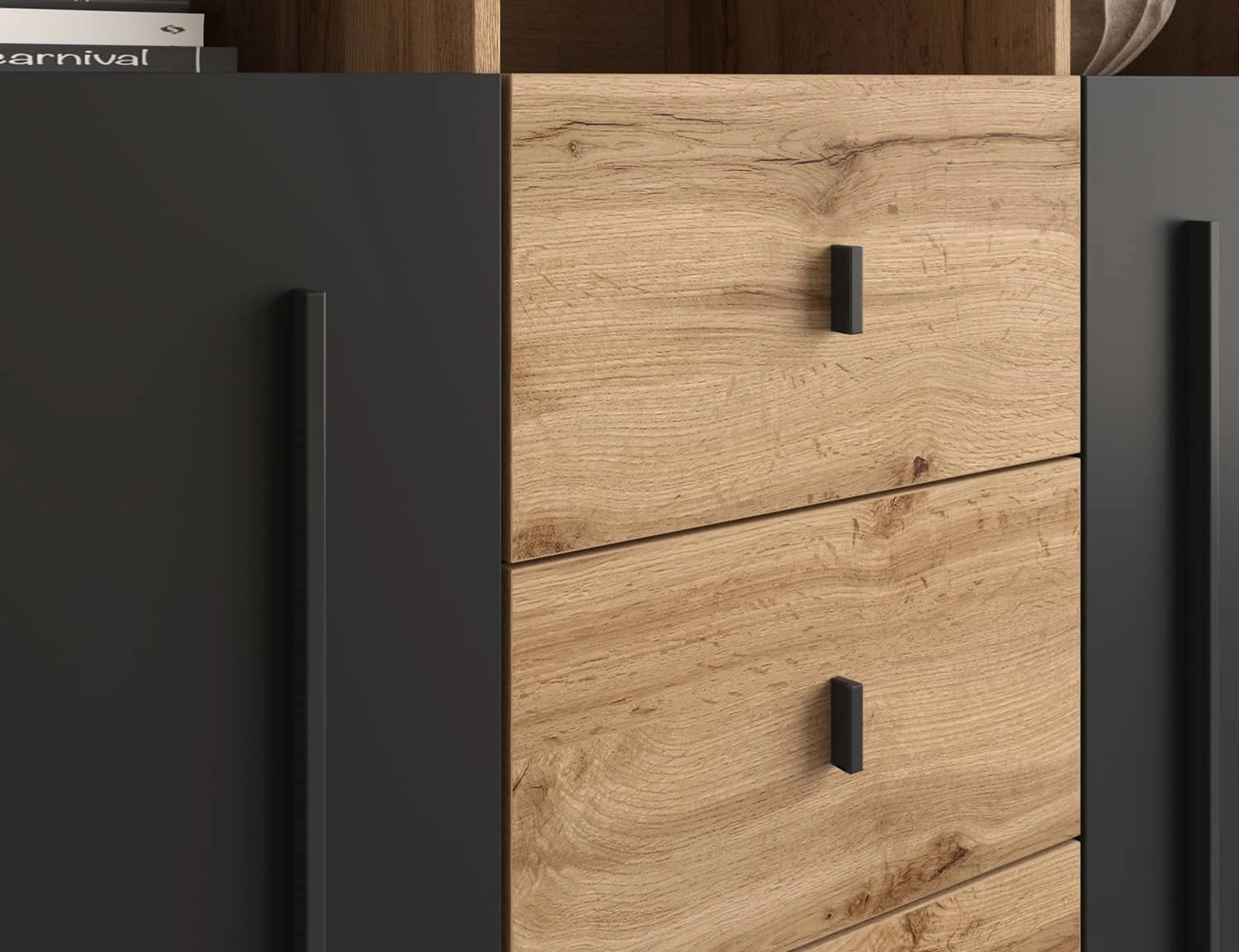 Komoda z szufladami z kolekcji Roger to idealne bryły do nowoczesnych wnętrz w jasnych barwach, jak i bardziej stonowanych, industrialnych aranżacji. Obecność komody stanie się stylowym wykończeniem pomieszczenia oraz nada mu szczególnego charakteru. Modny odcień dębu został przełamany wstawkami w kolorze czarnym co sprawia, że meble prezentują się bardzo elegancko i szykownie. Uchwyty w kolorze czarnym to element, który przyciągają wzrok i sprawia, że całość prezentuje się bardzo gustownie.
