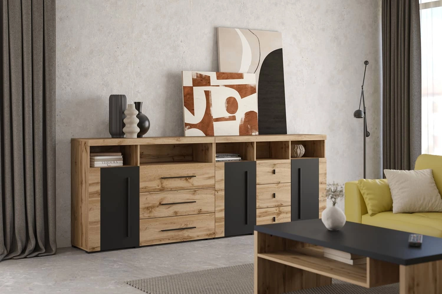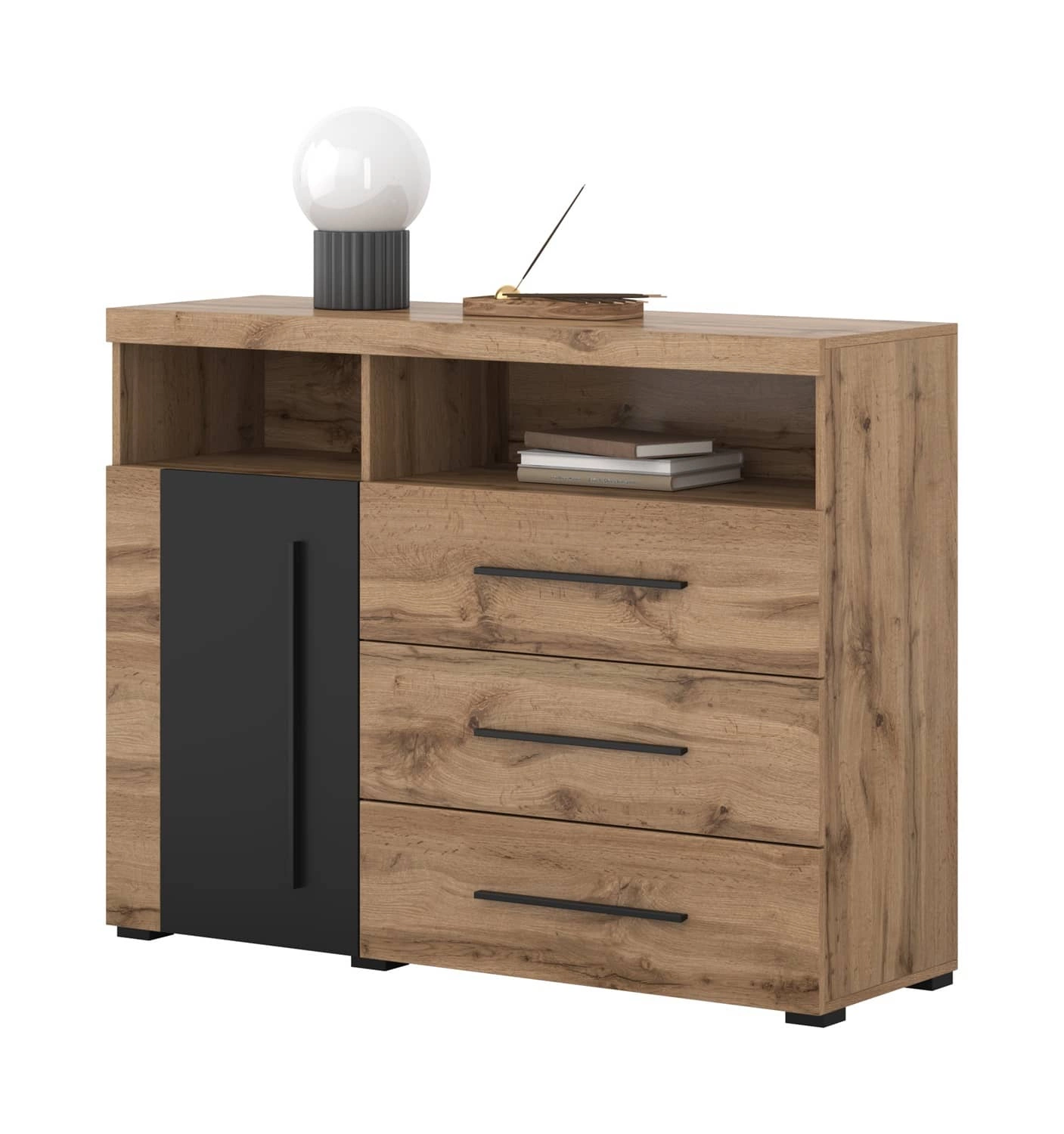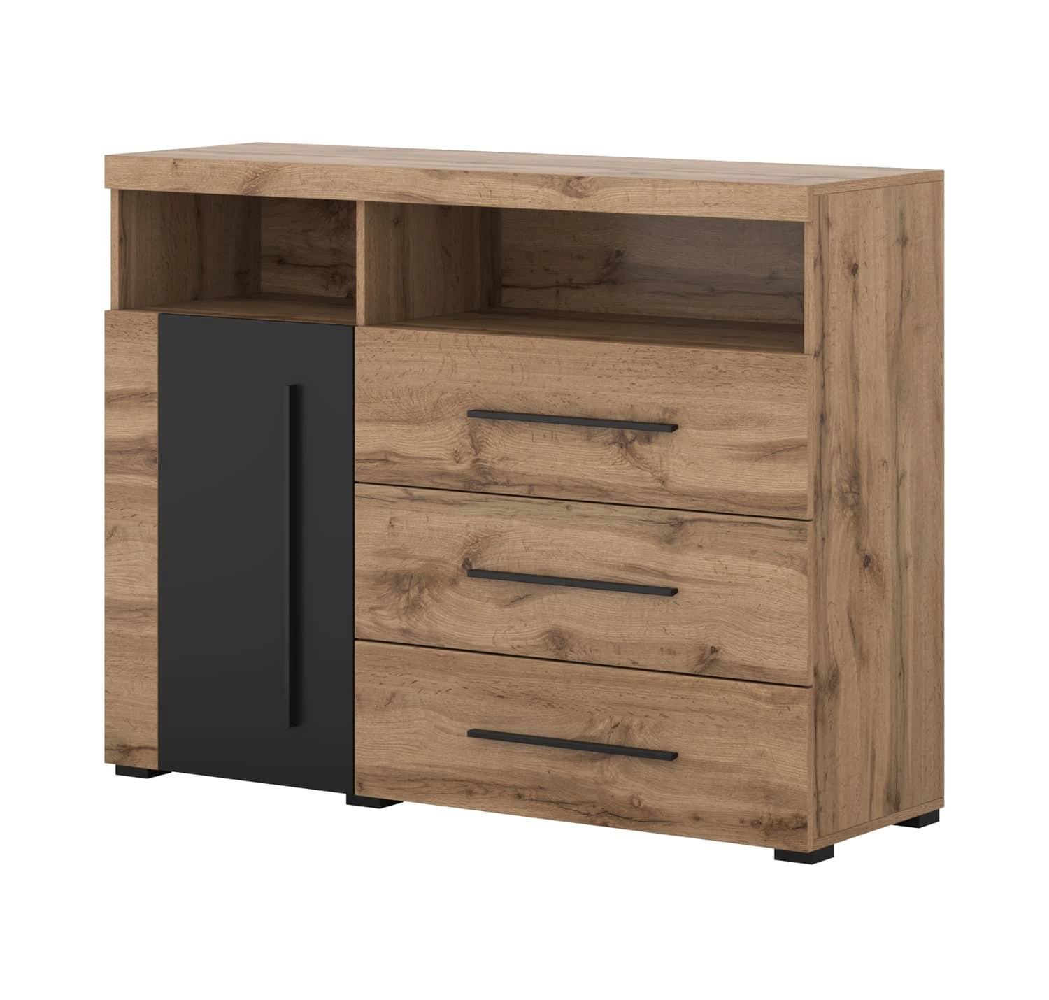Komoda z szufladami Roger 121 cm dąb wotan / czarny nowoczesna stylistyka komody wzbogacona o stylowe czarne dodatki idealna do salonu sypialni