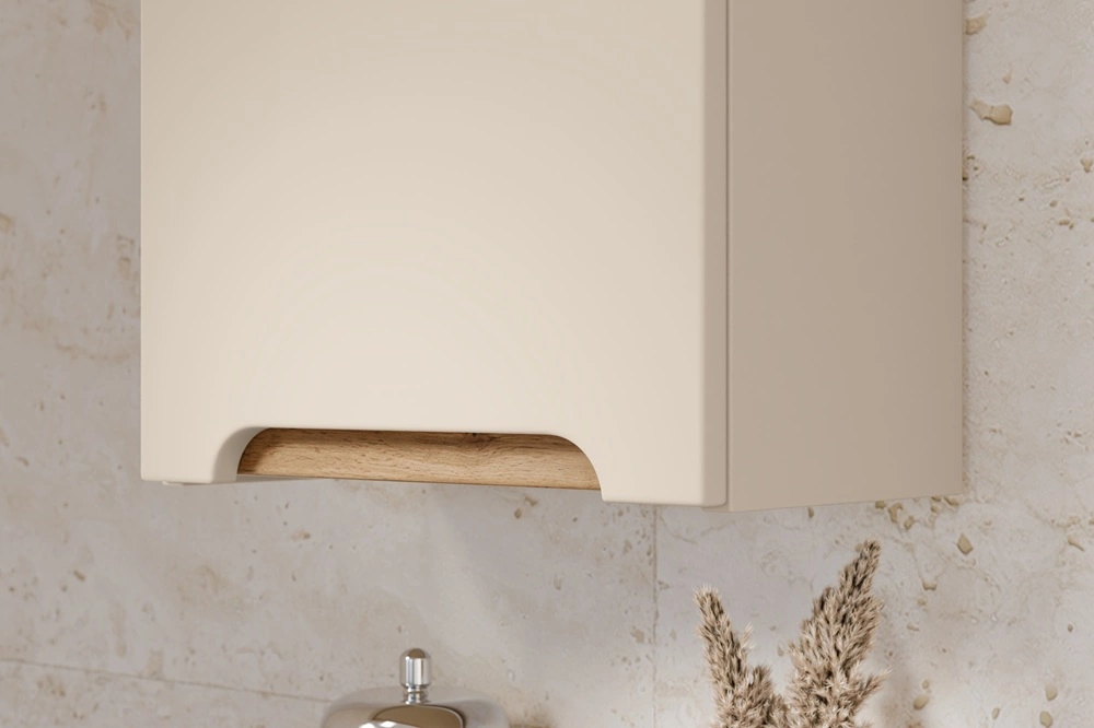 Szafki łazienkowe wiszące z kolekcji Bali zachwycą najbardziej wymagających miłośników minimalizmu w eleganckim wydaniu. Imponujące wzornictwo połączone z solidnymi korpusami w kaszmirowym odcieniu oraz drewnianymi detalami sprawia, że meble staną się centralnym elementem wystroju łazienki. Dodatkowym atutem mebli do łazienki są frezowane uchwyty, które są wyjątkowo praktyczne i wpisują się w aktualne trendy wnętrzarskie.