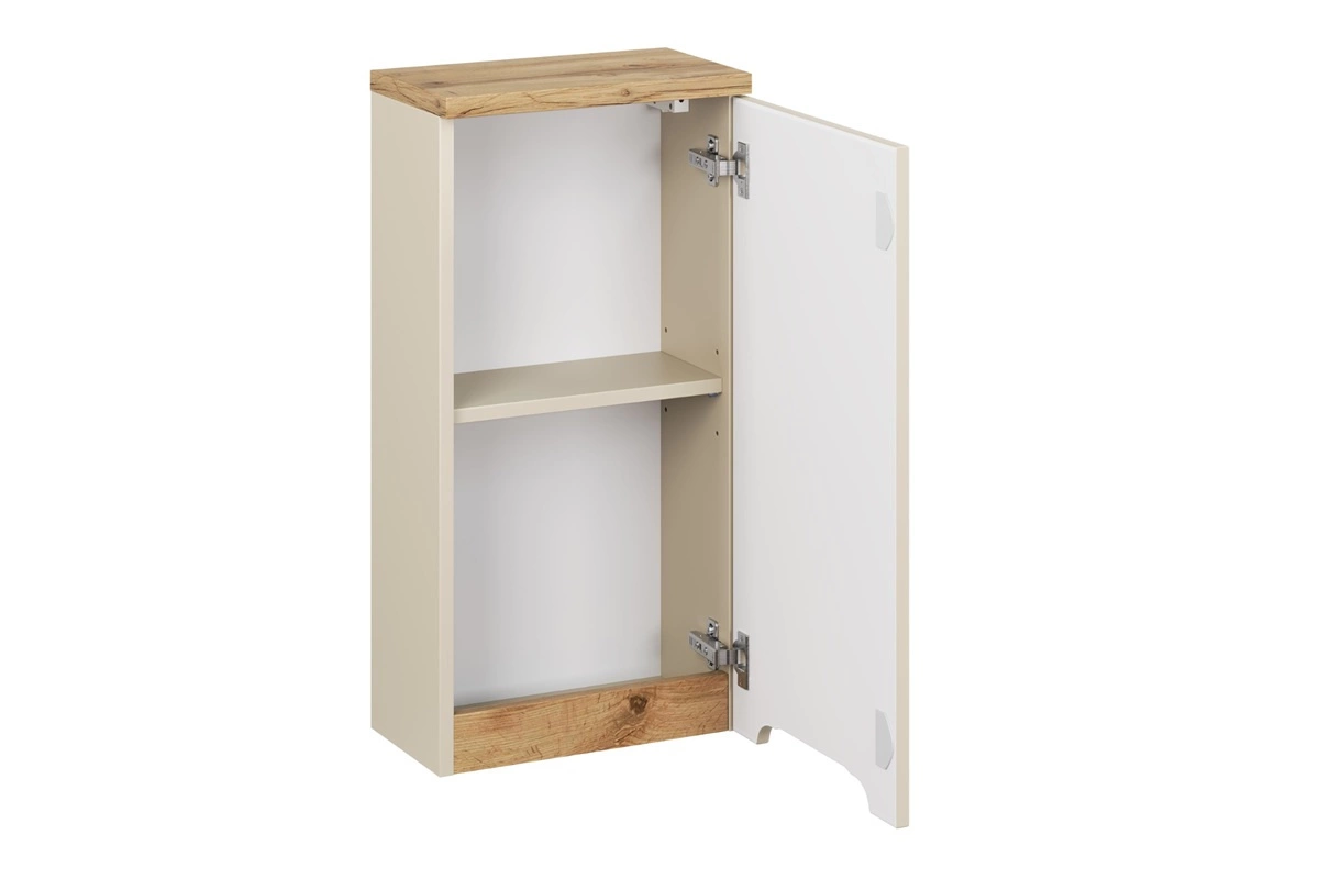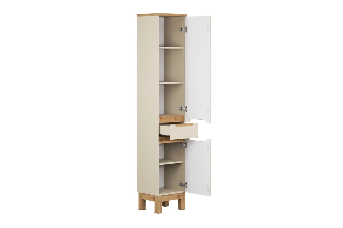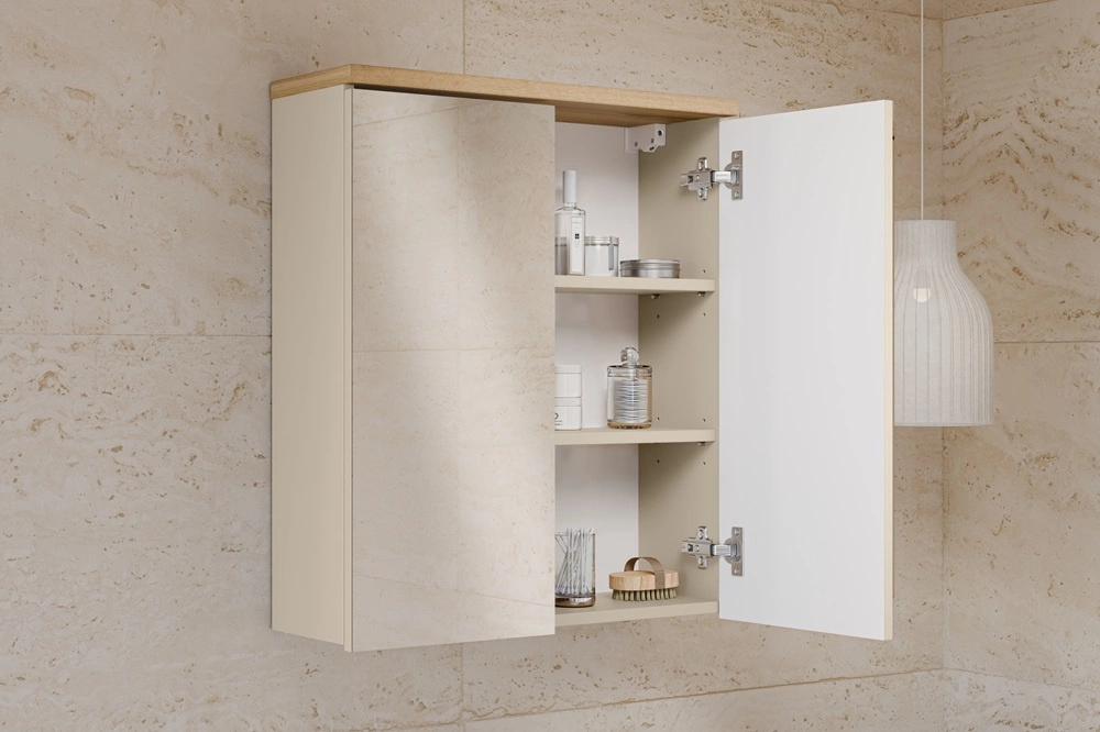 Zestaw mebli łazienkowych Bali beżowy / dąb wotan nowoczesne szafki do łazienki stylowe frezowane uchwyty stabilna podstawa