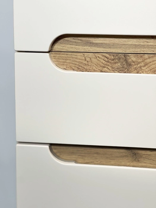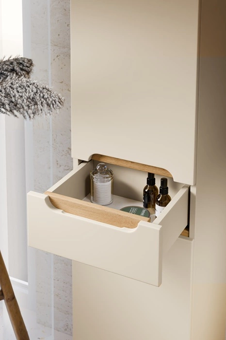 Meble do łazienki Bali zachwycą najbardziej wymagających miłośników minimalizmu w eleganckim wydaniu. Imponujące wzornictwo połączone z solidnymi korpusami w kaszmirowym odcieniu oraz drewnianymi detalami sprawia, że meble staną się centralnym elementem wystroju łazienki. Solidne, wysokie nogi każdej szafki stojącej z kolekcji Bali pozwala uzyskać zachwycający efekt, a dodatkowo ułatwia utrzymanie czystości w łazience. Dodatkowym atutem mebli do łazienki są frezowane uchwyty, które są wyjątkowo praktyczne i wpisują się w aktualne trendy wnętrzarskie.