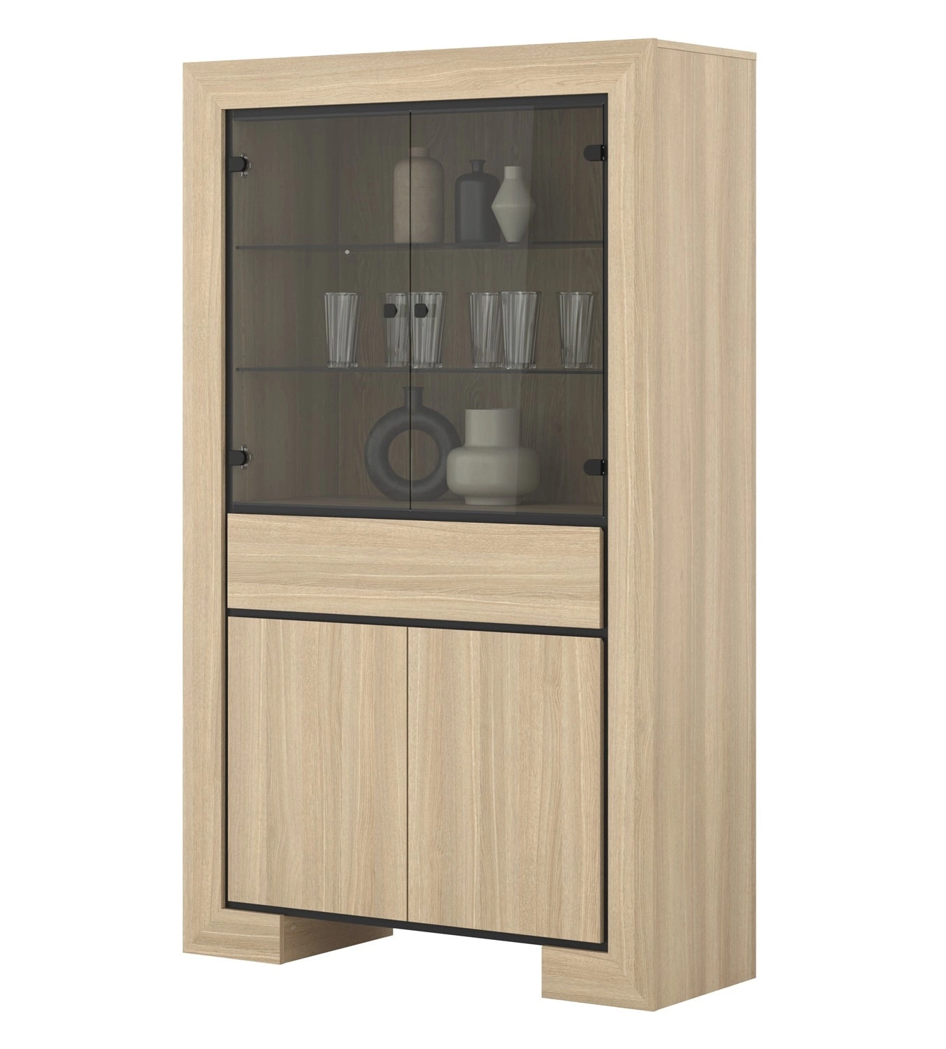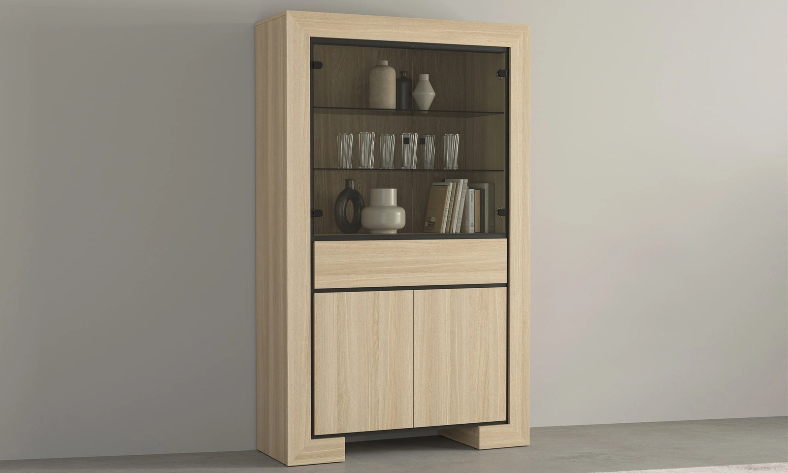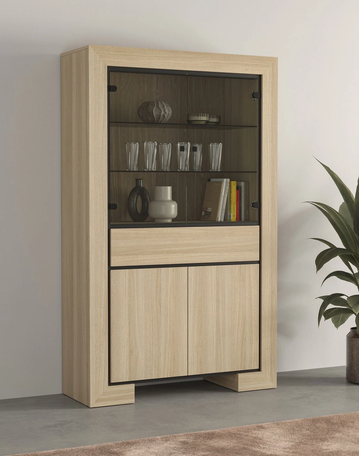 Witryna z szufladą Cuba łączy w sobie funkcjonalność z niezwykle wyjątkowym designem. Ciekawe zestawienie ciepłego dekoru drewna z wstawkami w kolorze czarnym nadaje meblom nowoczesnego wyglądu i kontrastu. Geometryczny kształt, masywne nogi, delikatnie przydymione szkło oraz fronty o gładkim wykończeniu stanowią oryginalną i niebanalną dekorację. Dopełnieniem frontów witryny są czarne wykończenia w postaci listew. Designerska konstrukcja witryny idealnie koresponduje z aktualnymi trendami wnętrzarskimi dzięki czemu meble z kolekcji Cuba łatwo zaaranżować w salonie, jadalni lub w gabinecie.