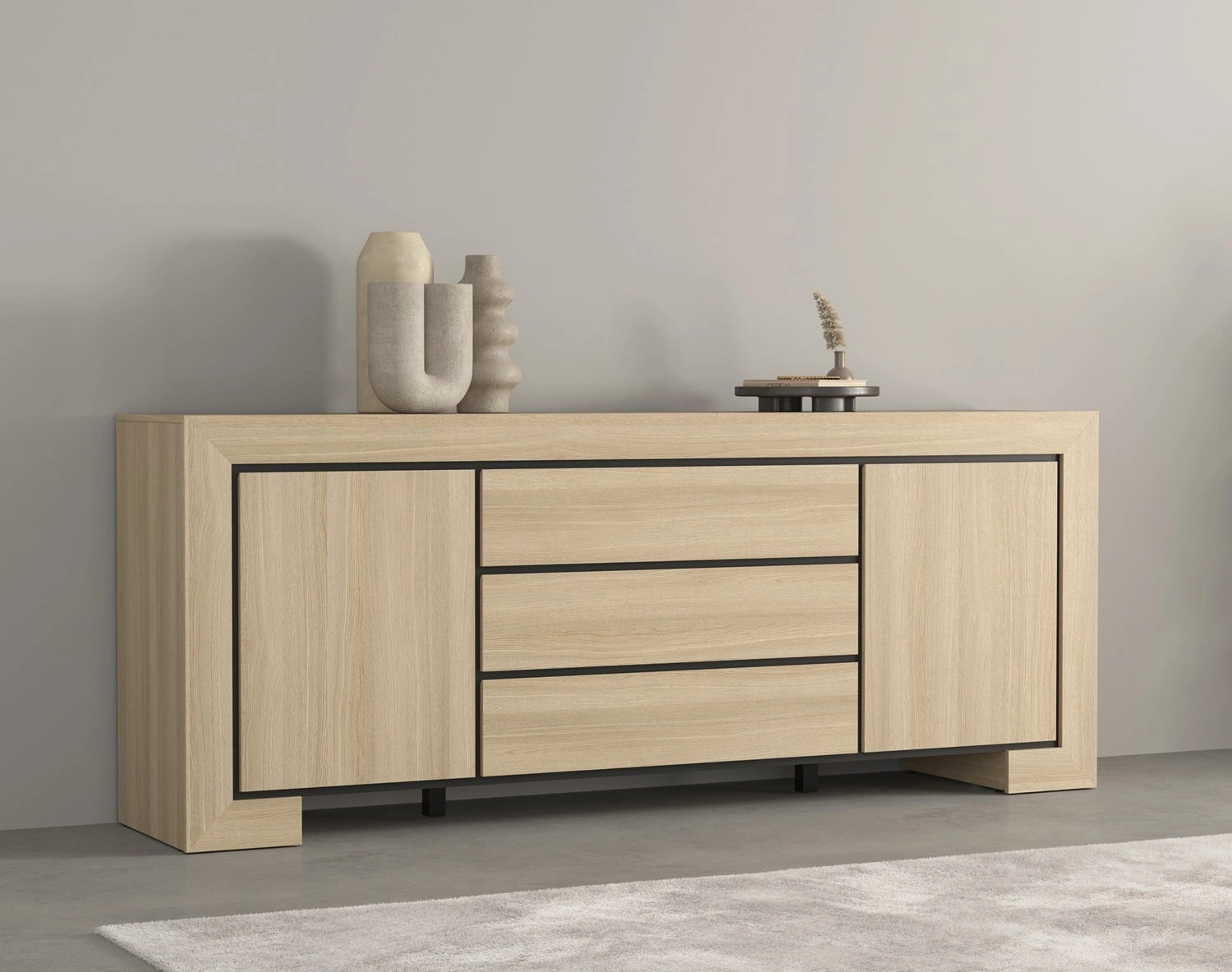 Komoda z szufladami Cuba 225 cm dąb samdal elegancka stylistyka komody wzbogacona o stylowe czarne dodatki idealna do salonu frezowane uchwyty