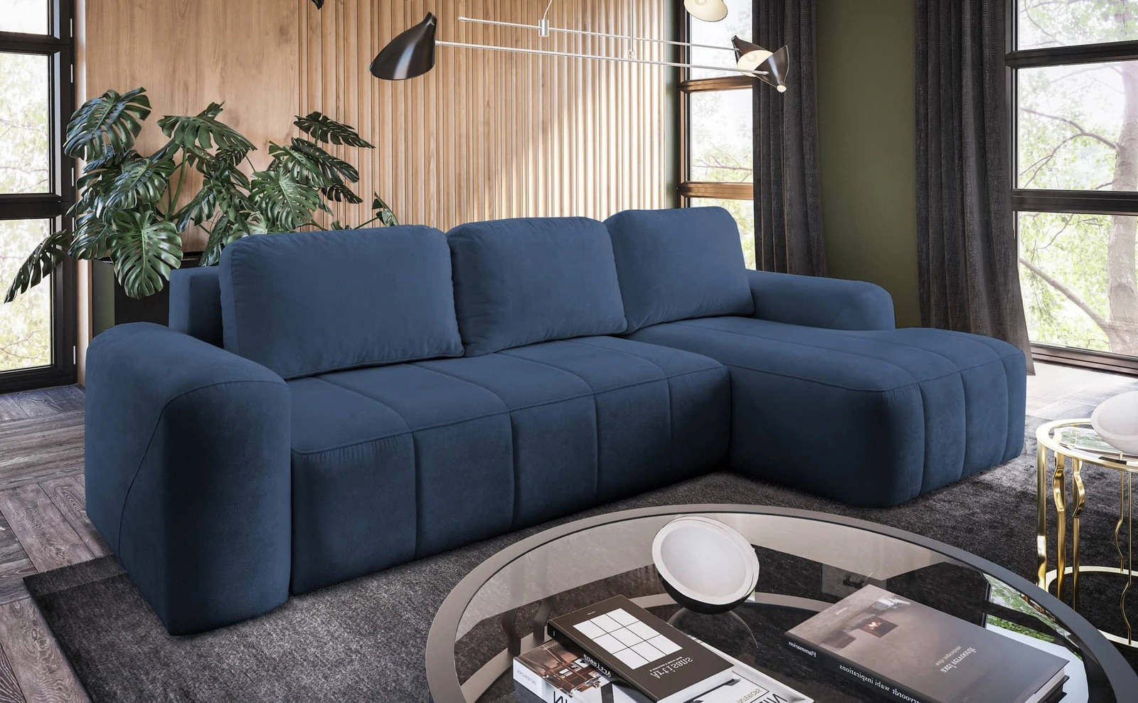 Narożnik z funkcją spania Bovec niebieski prawostronny stylowy narożnik rozkładany o ergonomicznym kształcie hydrofobowa tkanina