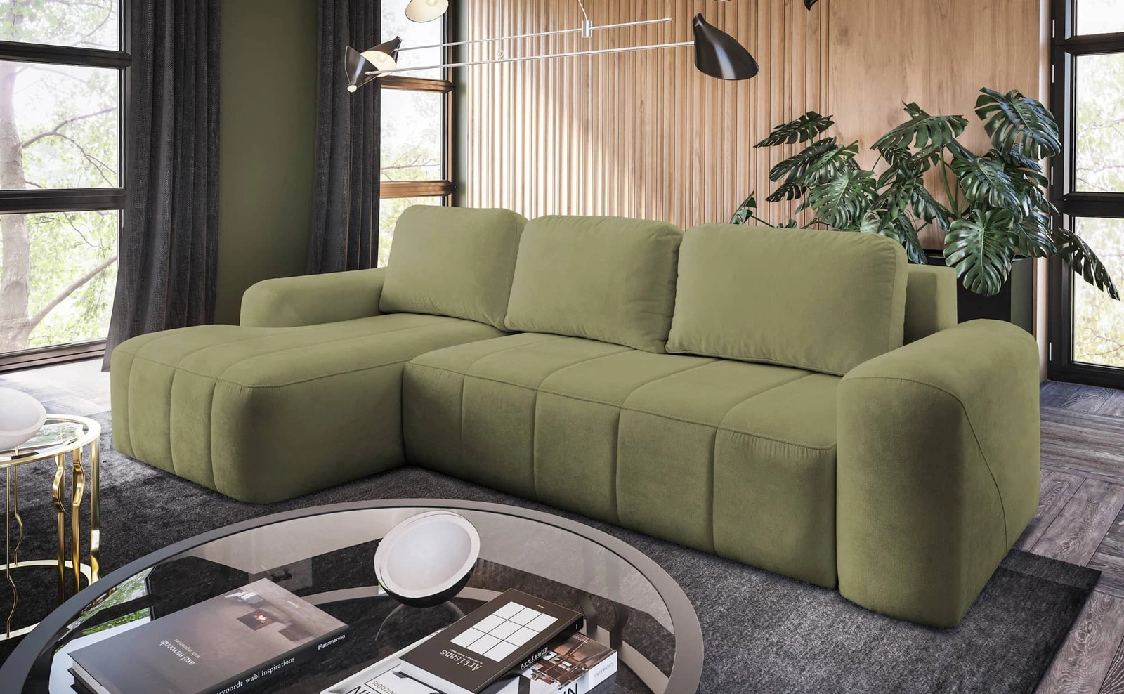 Narożnik z funkcją spania Bovec oliwkowy lewostronny stylowy narożnik rozkładany o ergonomicznym kształcie hydrofobowa tkanina