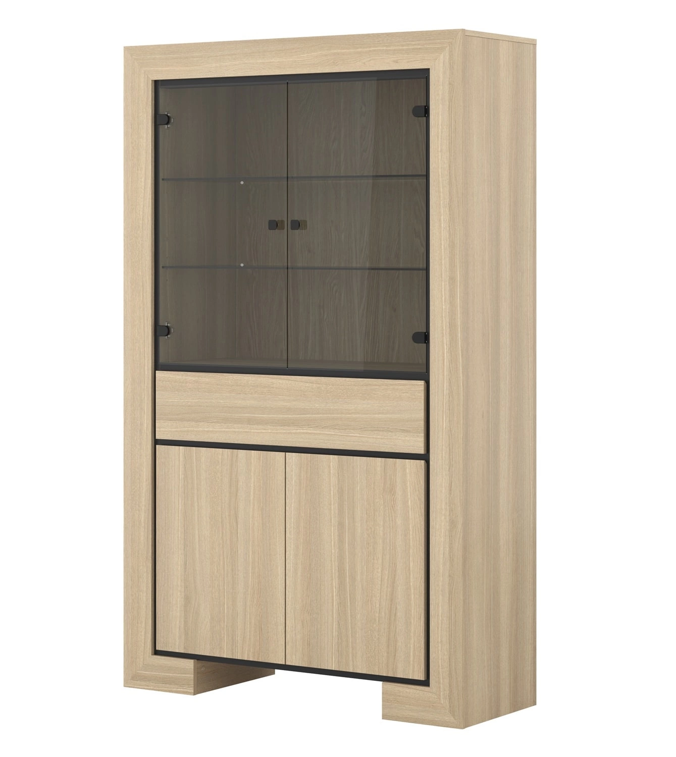 Meble z kolekcji Cuba łączy w sobie funkcjonalność z niezwykle wyjątkowym designem. Ciekawe zestawienie ciepłego dekoru drewna z wstawkami w kolorze czarnym nadaje meblom nowoczesnego wyglądu i kontrastu. Geometryczny kształt, masywne nogi, delikatnie przydymione szkło oraz fronty o gładkim wykończeniu stanowią oryginalną i niebanalną dekorację. Dopełnieniem frontów mebli są czarne wykończenia w postaci listew. Designerska konstrukcja mebli idealnie koresponduje z aktualnymi trendami wnętrzarskimi dzięki czemu meble z kolekcji Cuba łatwo zaaranżować w salonie, jadalni lub w gabinecie.