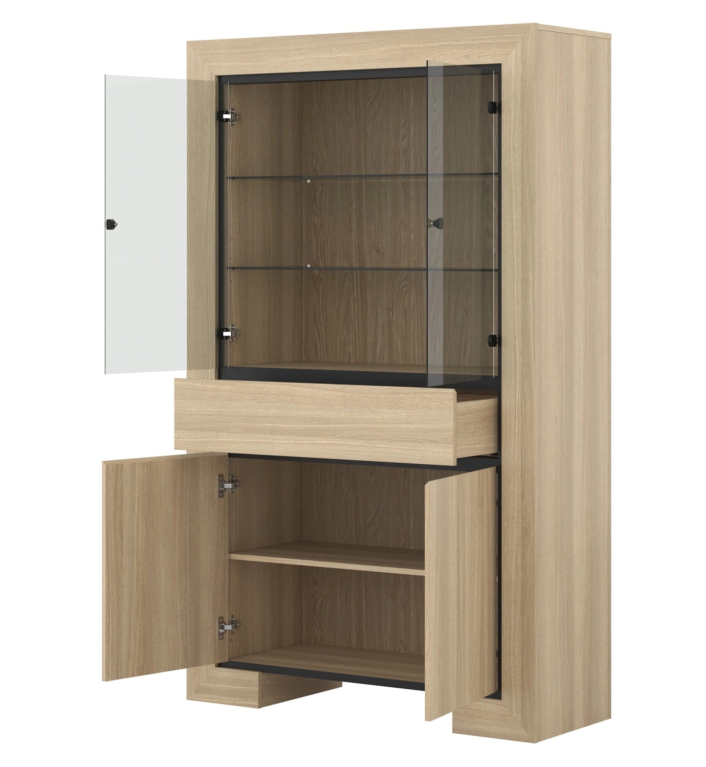 Pojemne szuflady oraz zamykane szafki meblościanki pomieszczą wszystkie rzeczy oraz niezbędne akcesoria. Zestaw mebli do salonu wykonany został z wysokiej jakości płyty meblowej, która charakteryzuje się odpornością na wpływ czynników zewnętrznych takich jak obicia, uderzenia i niefortunne zadrapania. Meblościanka Cuba gwarantuje komfortowe i bezproblemowe korzystanie oraz trwałość całego mebla przez wiele lat użytkowania. Przeszklone fronty oraz szklane półki witryny wykonane są z bezpiecznego szkła hartowanego. Standardowym wyposażeniem mebli są zawiasy oraz prowadnice z systemem cichego domykania.