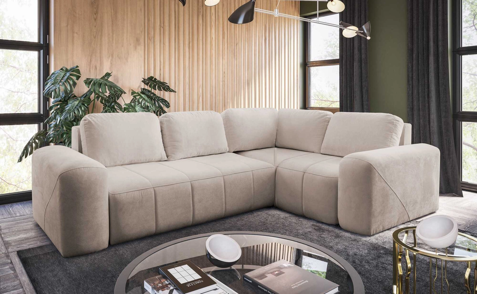 Narożnik z funkcją spania Bovec II beżowy prawostronny komfortowy narożnik rozkładany o stylowym charakterze pojemnik na pościel