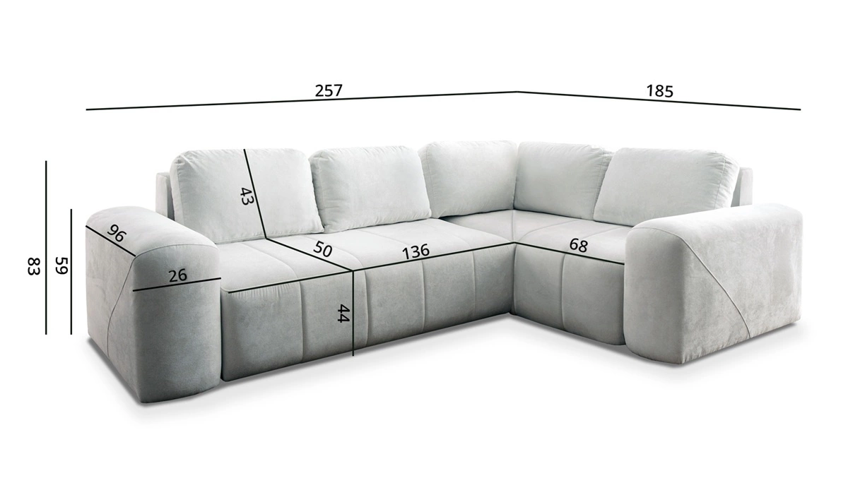 Wymiary mebla pozwolą na zapełnienie przestrzeni w przestronnym salonie lub pokoju dziennym. Szerokość narożnika 257 cm, wysokość 83 cm oraz głębokość 185 cm. Powierzchnia spania narożnika wynosi 125x205 cm. Wysokość siedziska mebla to 44 cm a wysokość oparcia wynosi 43 cm. Sprężyny faliste oraz pianka poliuretanowa T30 to materiał, z którego wykonane zostało siedzisko narożnika. Miękkie poduchy oparciowe zapewnią wysoki komfort podczas codziennego odpoczynku, który docenisz Ty a także goście, którzy zasiądą na tym wyjątkowym narożniku.