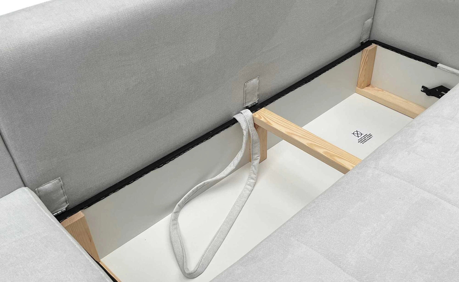 Dodatki tego mebla, które docenią wszyscy użytkownicy to pojemnik na pościel oraz szerokie i miękkie podłokietniki.