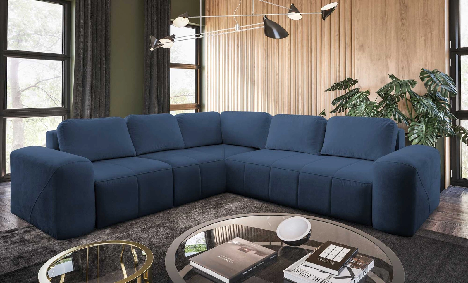 Narożnik z funkcją spania Bovec III niebieski lewostronny niezwykle stylowy narożnik rozkładany doskonały do przestronnego salonu