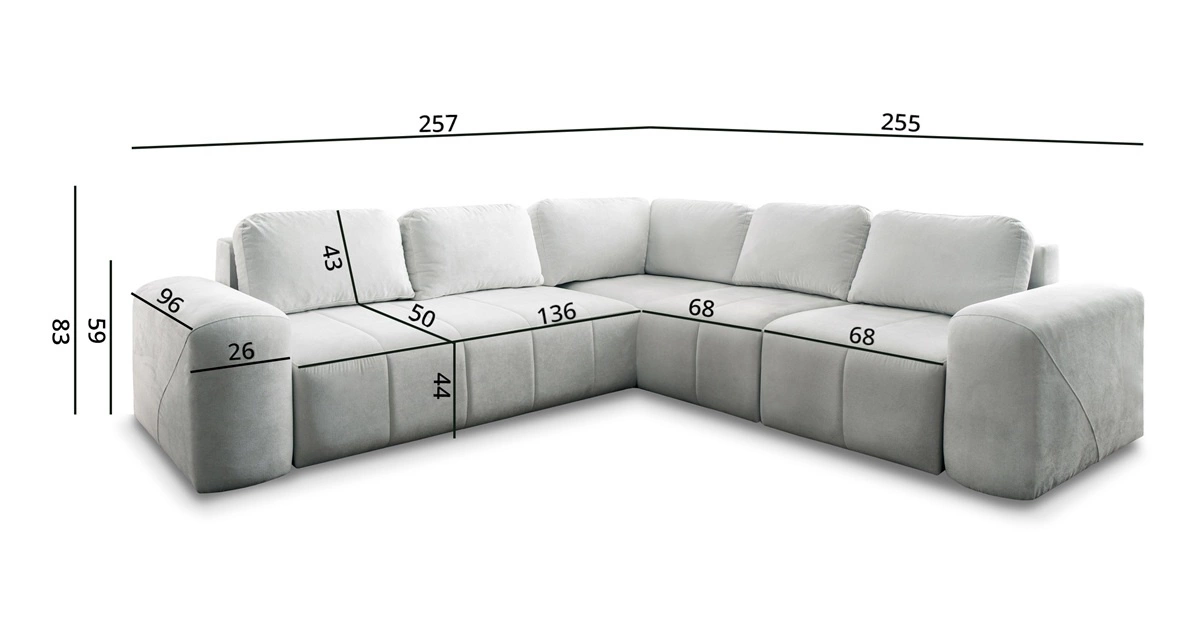 Wymiary mebla pozwolą na zapełnienie przestrzeni w przestronnym salonie lub pokoju dziennym. Szerokość narożnika 257 cm, wysokość 83 cm oraz głębokość 255 cm. Powierzchnia spania narożnika wynosi 125x205 cm. Wysokość siedziska mebla to 44 cm a wysokość oparcia wynosi 43 cm. Sprężyny faliste oraz pianka poliuretanowa T30 to materiał, z którego wykonane zostało siedzisko narożnika. Miękkie poduchy oparciowe zapewnią wysoki komfort podczas codziennego odpoczynku, który docenisz Ty a także goście, którzy zasiądą na tym wyjątkowym narożniku.