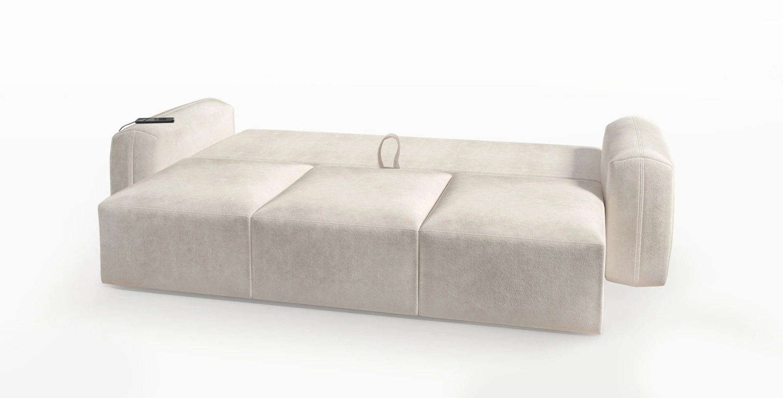Dodatki tego mebla, które docenią wszyscy użytkownicy to funkcja spania, pojemnik na pościel oraz gniazdo ładowania USB w boczku sofy.