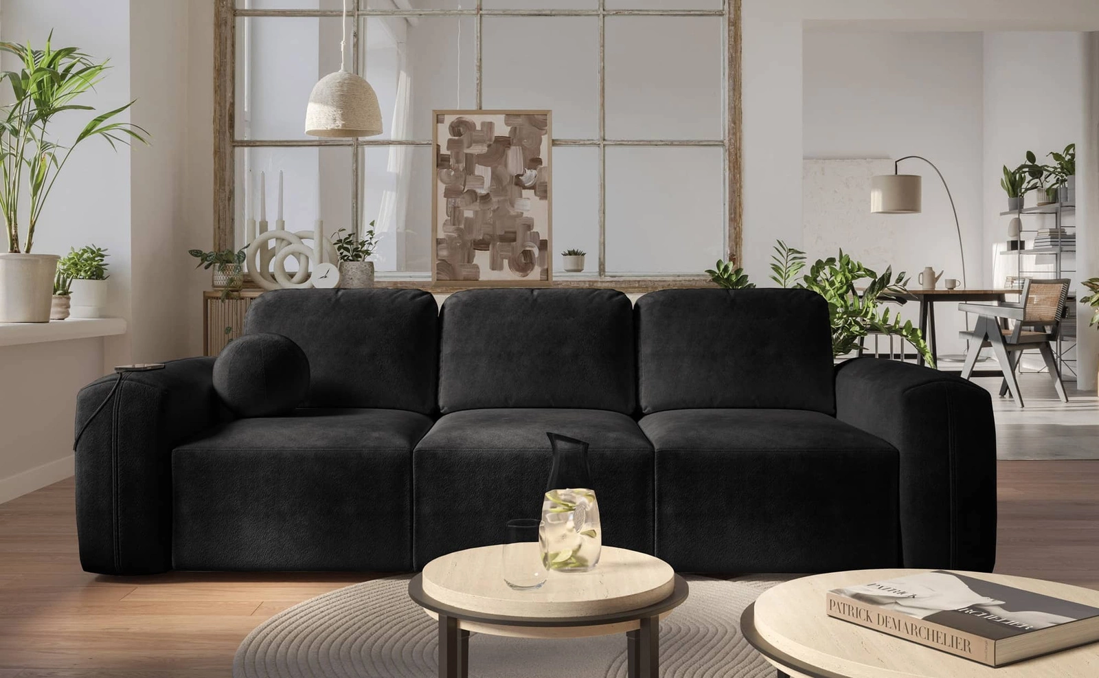 Sofa z funkcją spania Arbon czarna komfortowa i stylowa sofa do salonu miękka pluszowa tkanina nadaje unikalnego charakteru