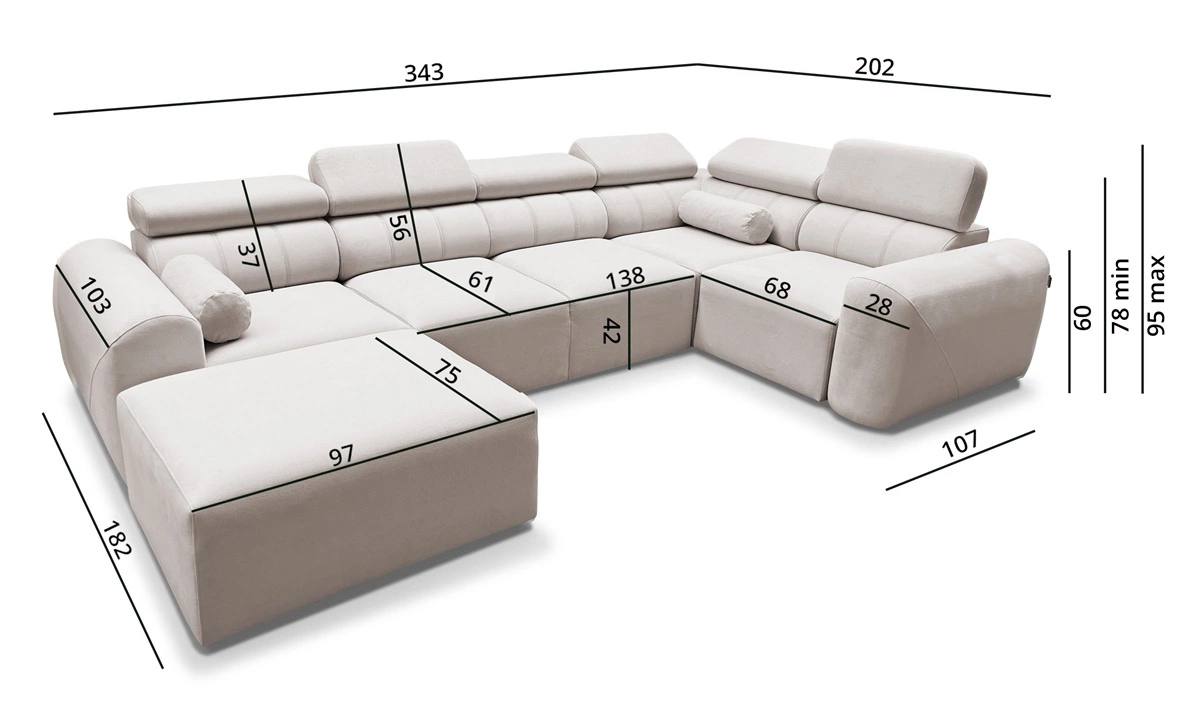 Wymiary mebla pozwolą na zapełnienie przestrzeni w przestronnym salonie lub pokoju dziennym. Szerokość narożnika 343 cm, wysokość maksymalna 95 cm oraz głębokość 202 cm. Powierzchnia spania narożnika wynosi 132x268 cm. Wysokość siedziska mebla to 42 cm a maksymalna wysokość oparcia wynosi 56 cm. Sprężyny faliste oraz pianka poliuretanowa T30 to materiał, z którego wykonane zostało siedzisko narożnika. Oparcie z regulowanymi zagłówkami pozwoli na łatwe dostosowanie kąta nachylenia zagłówków do swoich preferencji oraz daje gwarancję wygodnego wypoczynku po długim dniu, które docenisz Ty, Twoi bliscy a także goście, którzy zasiądą na tym wyjątkowym narożniku.