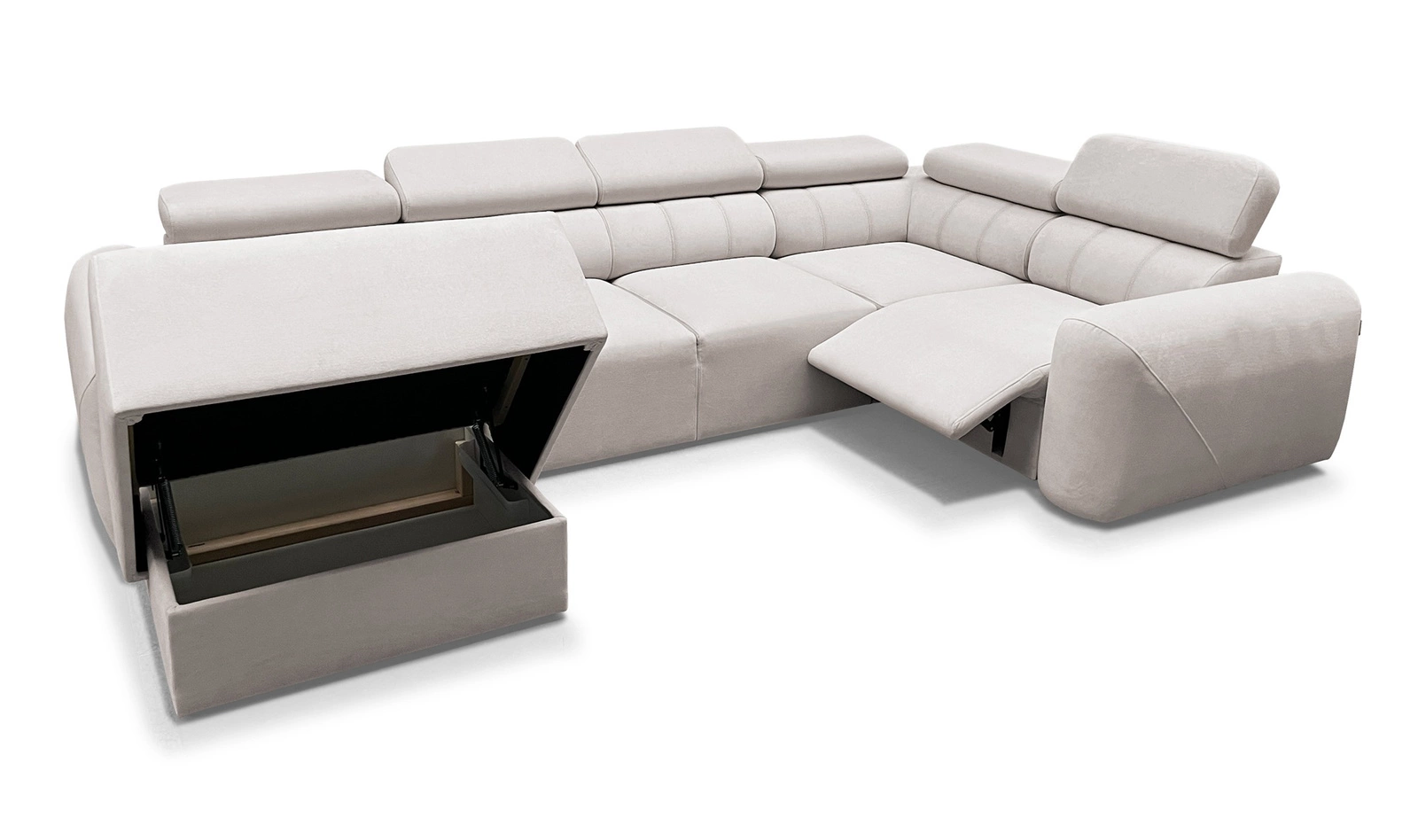 Dodatki tego mebla, które docenią wszyscy użytkownicy to elektrycznie podnoszony podnóżek, regulowane zagłówki, funkcja spania oraz pojemnik na pościel.