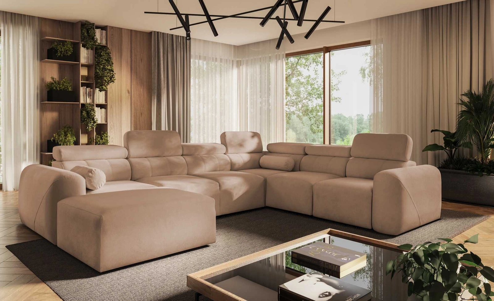 Narożnik z funkcją spania Cantare VIII łososiowy lewostronny gustowny narożnik z regulowanymi zagłówkami pojemniki na pościel