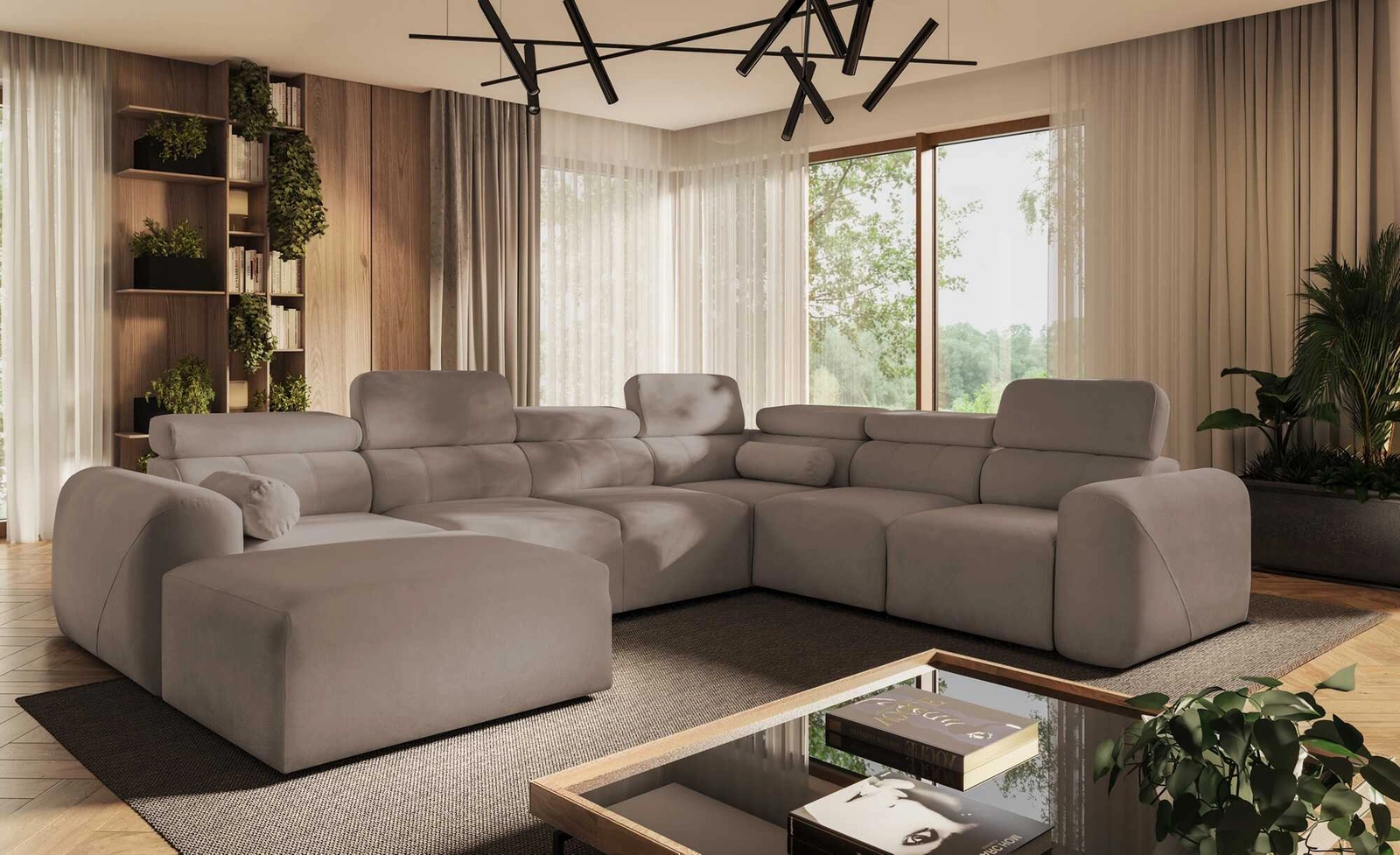 Narożnik z funkcją spania Cantare VIII ciemny beż lewostronny gustowny narożnik z regulowanymi zagłówkami pojemniki na pościel